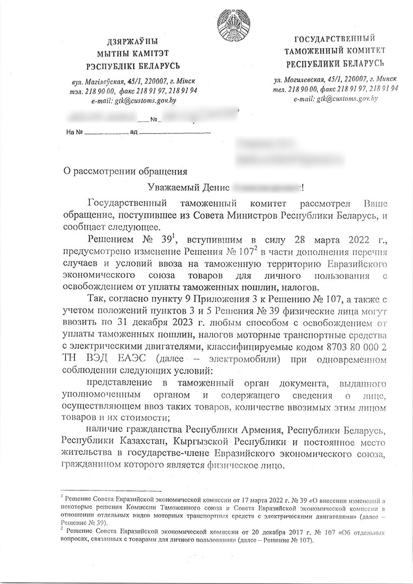 Мы получили документальное подтверждение слов покупателей электрокаров. На таможне требуют: или платите всю сумму растаможки, или предоставьте документы о льготе, выданные уполномоченным органом. Каким именно — не уточняется.