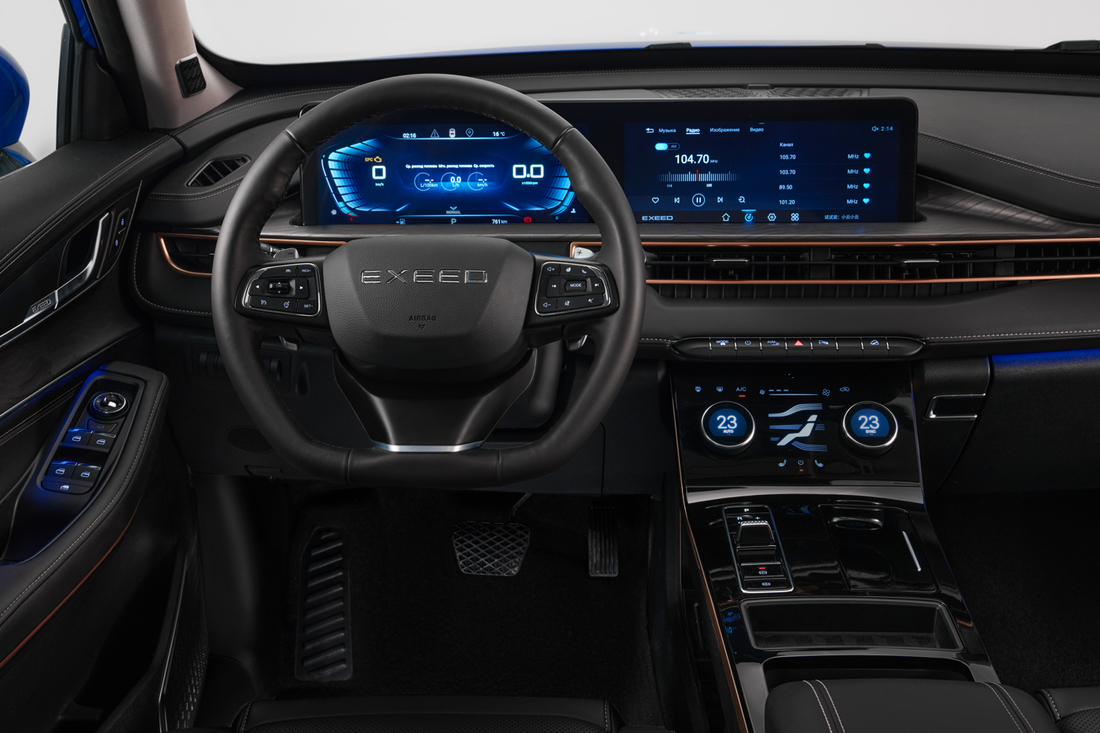 В Москве функционирует аж 18 дилеров Exeed! Официально в Таможенном союзе сертификат получили три модели бренда. Самая доступная — LX, которая продается по цене от 37 тысяч долларов по курсу. Это компактная машина с современным дизайном и на удивление дорогим салоном. Компоновка передней панели — нечто среднее между современными Mercedes и Range Rover. Технически это близкий родственник Chery Tiggo 7 Pro, который хорошо известен у нас. Под капотом — 1,5-литровый турбомотор мощностью 147 л. с. (тяга — 210 Н·м). Разгон до сотни занимает около 9 секунд. Едет этот автомобиль не хуже SUV с 2-литровыми «атмосферниками». Коробка передач — вариатор.