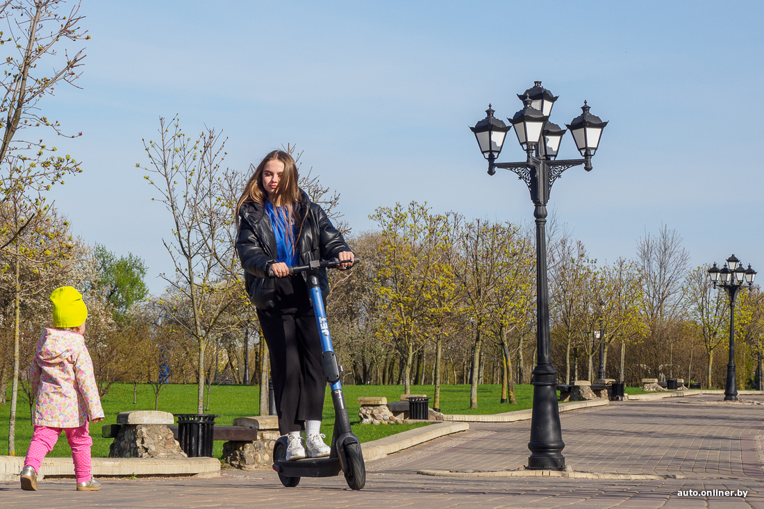 Но случается, что самокат и искать не надо: только подумаешь, а он уже тут как тут. И условный студент из нашей легенды был рад наткнуться на целый двухколесный парк у ворот универа — выбирай, что хочешь. Хотим разнообразия, поэтому начинаем поездку на синем Jet. Сервис в Минске второй год, вот и посмотрим, как освоился.