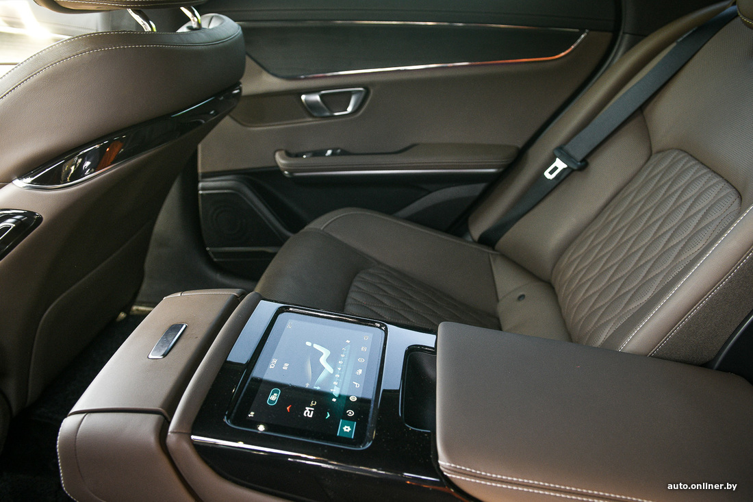 Сзади довольно просторно. В центральном подлокотнике предусмотрен сенсорный дисплей, позволяющий управлять настройками кресел, панорамной крышей, отдельной климатической зоной, развлекательным блоком и упомянутой выше подсветкой салона. Задний диван имеет отдельные регулировки.