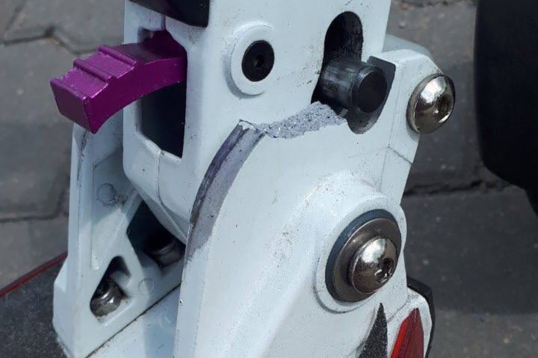 Злата раньше каталась на Kugoo S3 Pro, но отказалась от этой модели после неприятного инцидента. «Проехала на нем около 70 км, — вспоминает девушка. — Потом муж однажды собрался в магазин, взял Kugoo. Вес супруга — 85 кг. Во время движения крепление, соединяющее платформу и рулевую стойку, отломалось, и вся конструкция сложилась. Муж упал и ободрал колено. При этом рычажок складного механизма находился в закрепленном положении, то есть не выдержал именно каркас. После поломки удалось выяснить, из чего сделан S3 Pro: это какой-то рыхлый порошковый материал с воздушными пустотами. После этого происшествия сдала самокат обратно в магазин».