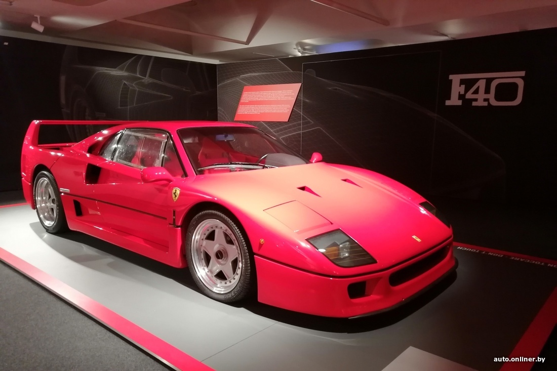 Отдельный зал музея в Маранелло отведен под гиперкары марки. Один из них — купе F40 1987 года, последняя модель Ferrari, разработанная при жизни Энцо. В движение «двухдверка» приводилась мотором V8 объемом 2,9 л, мощность которого с помощью двойного турбонаддува достигала 478 л. с. До 100 км/ч F40 разгонялась за 4,1 секунды, максимальная скорость — 324 км/ч.
