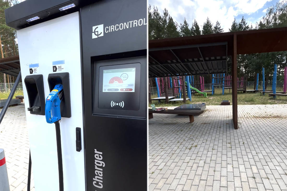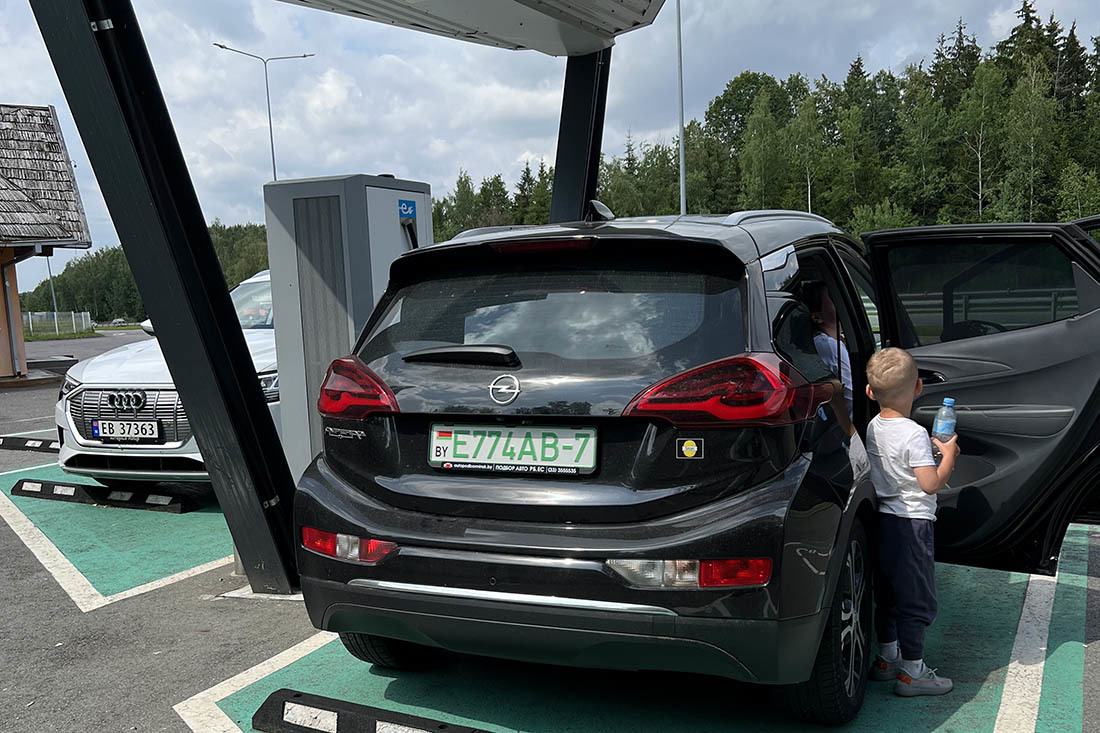 Полчасика заряжались в 150 км от Паланги, а затем еще столько же между Каунасом и Вильнюсом. Обратил внимание на устройство бесплатной зарядки у трассы: скамейки, навесы, детская площадка. Ни за что платить не надо. Две остановки по 30 минут, которые пришлось потратить на дозаправку, абсолютно не смущали. Пожалуй, и на машине с ДВС я бы их сделал, просто для отдыха. Бесплатных станций много, они обозначены отдельным знаком, и пропустить их довольно трудно. Заряда мне как раз хватило, чтобы доехать до Минска с запасом в 40 км. И это с учетом того, что по дороге мы несколько раз заезжали в магазины и стояли на границе не выключая электронику.