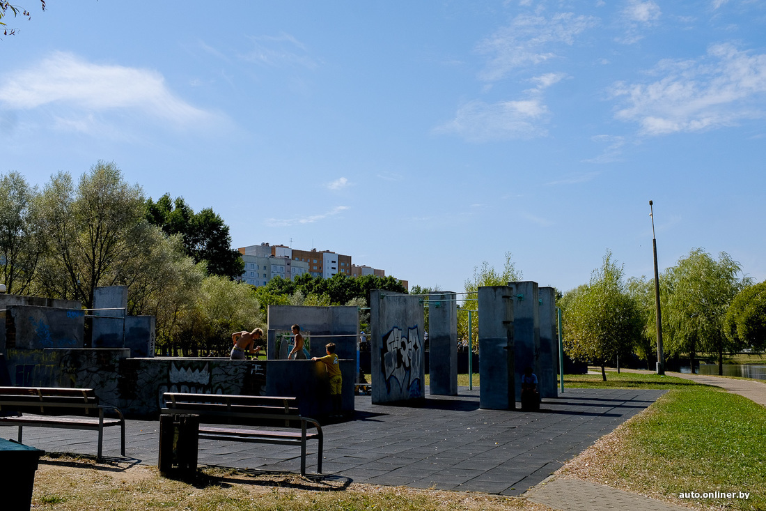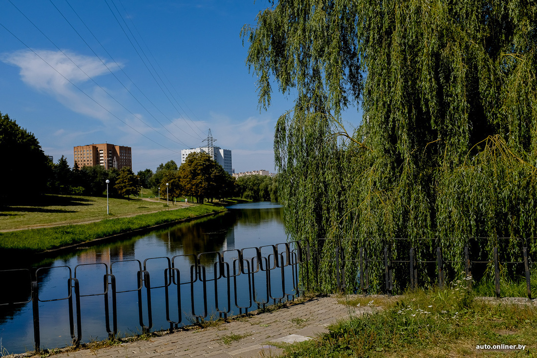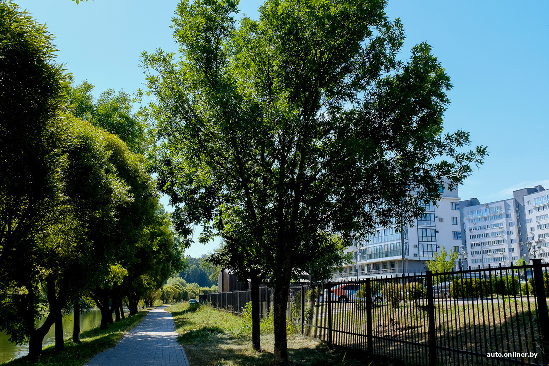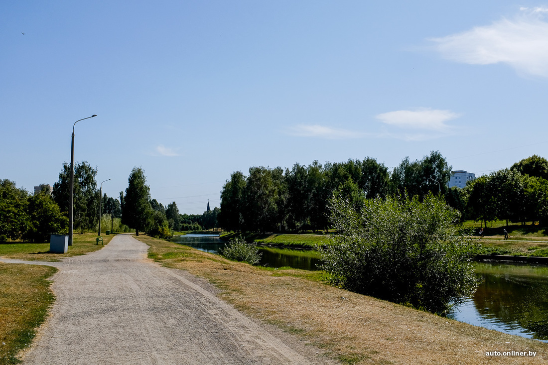 Переезжаем улицу Франциска Скорины и начинаем новую главу этого путешествия. Парк у Большой Слепянки с ее элитной застройкой кажется просторным и даже несколько пустынным — так здесь немноголюдно. Тротуарную плитку сменяет утрамбованная насыпь, и по ней катить гораздо приятнее.