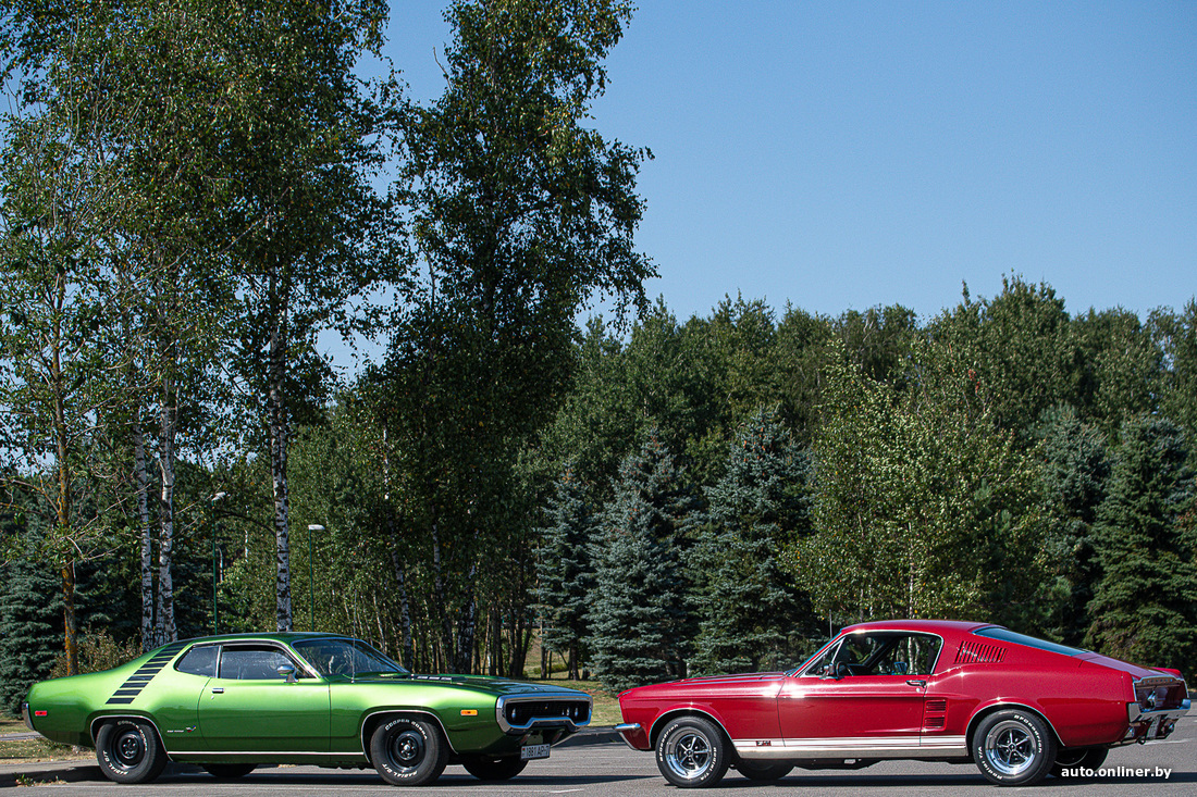 На следующем фото Road Runner запечатлен с одним из своих главных соперников — Ford Mustang в редкой версии «фастбэк». Оба этих маслкара, как и множество других интересных автомобилей и мотоциклов, можно будет увидеть на выставке Vintageday, которая пройдет 3—4 сентября на территории завода им. Кирова (Минск, ул. Красноармейская, 21).