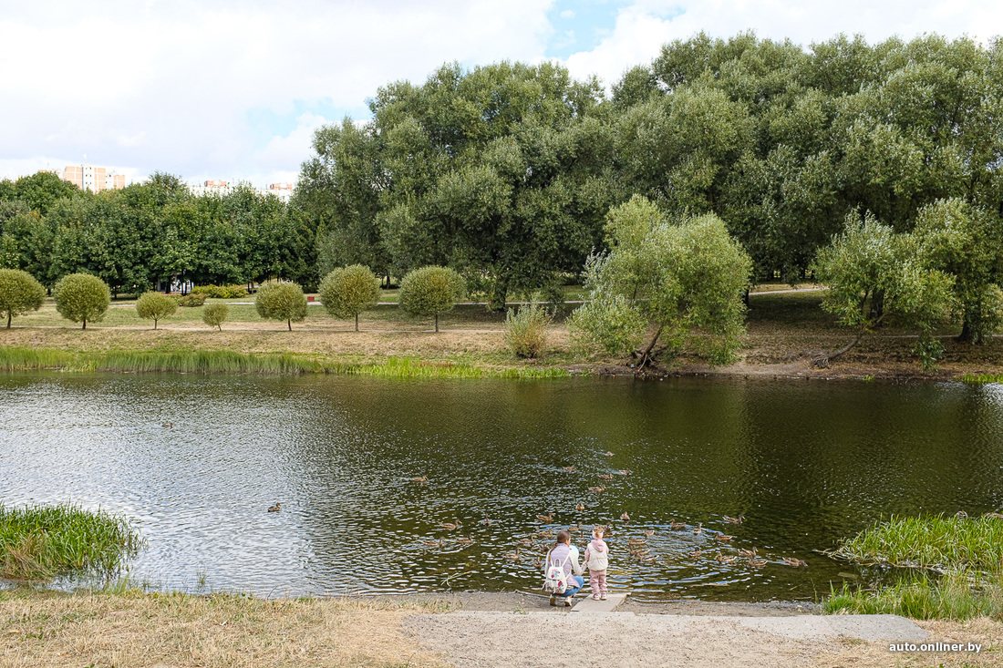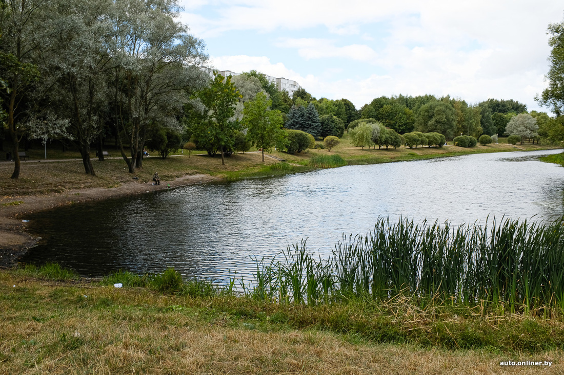Водная гладь в парке — река Лошица. Если бы была возможность проследовать вдоль нее на восток, мы бы выехали аккурат к Лошицкому парку — был бы замечательный маршрут, нужно сказать. Однако воплотить эту задумку в жизнь не получится: река то и дело прячется под землю, а проезд даже к Курасовщине наглухо перекрыт железной дорогой, объезжать которую слишком неудобно.