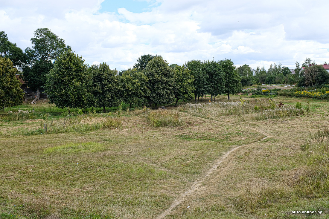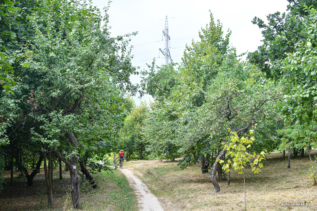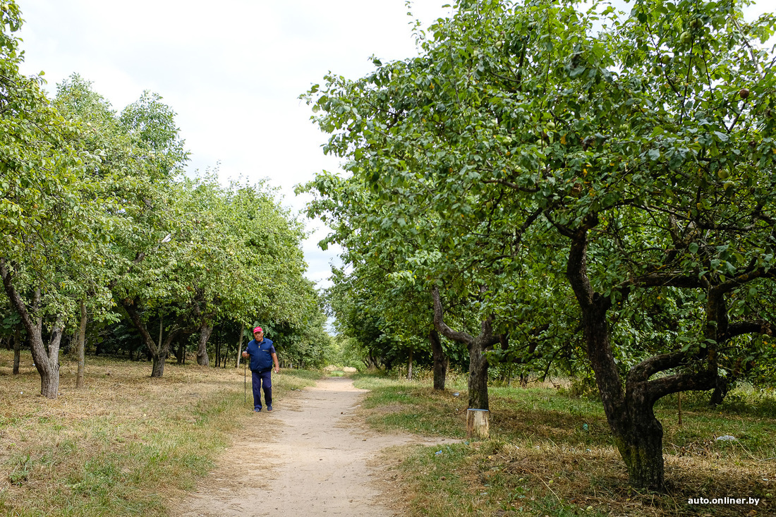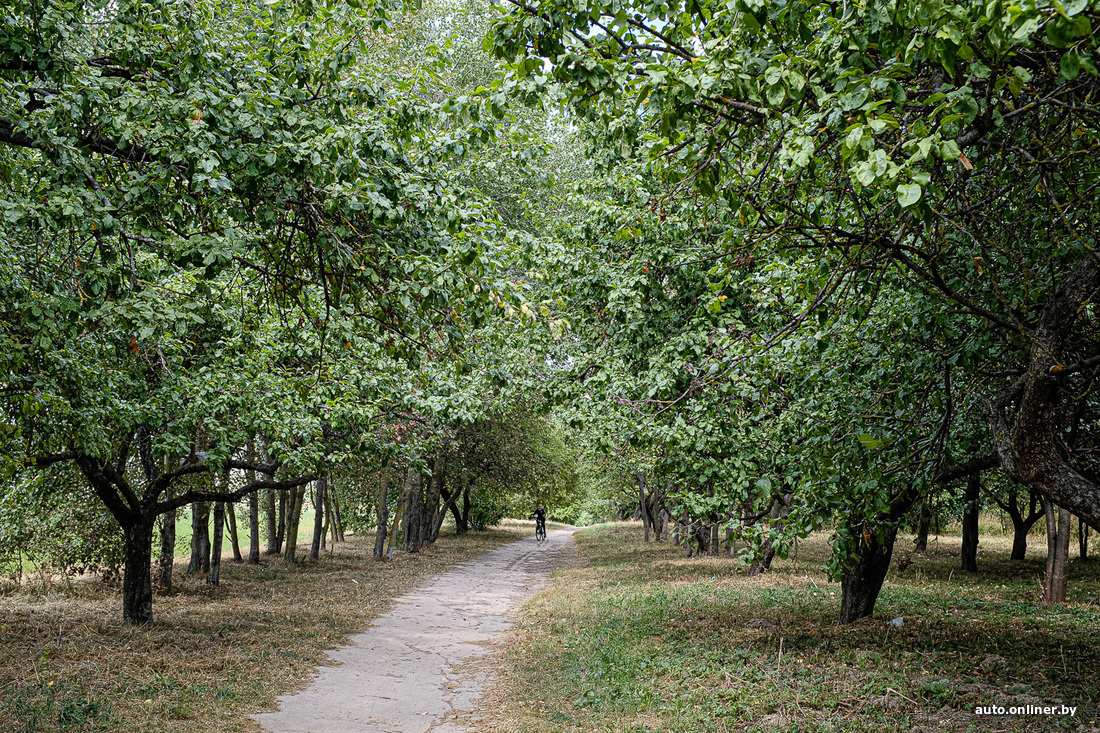 С поля сворачиваем в большущий яблоневый сад. Как раз сезон: яблоки на деревьях, на земле. Кажется, они даже в воздухе — дышится яблоками. Местные рассказывают, что сад здесь был всегда, но теперь мало кто вспомнит, когда он в полную мощь выполнял свою изначальную функцию. Пацаны и сегодня лазают по деревьям, может, что-то даже пробуют на зуб, а под деревьями тропинки вот уже много лет как облюбовали любители пеших прогулок.