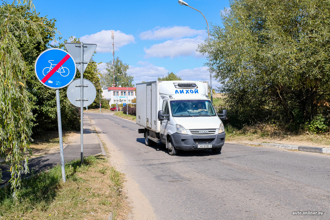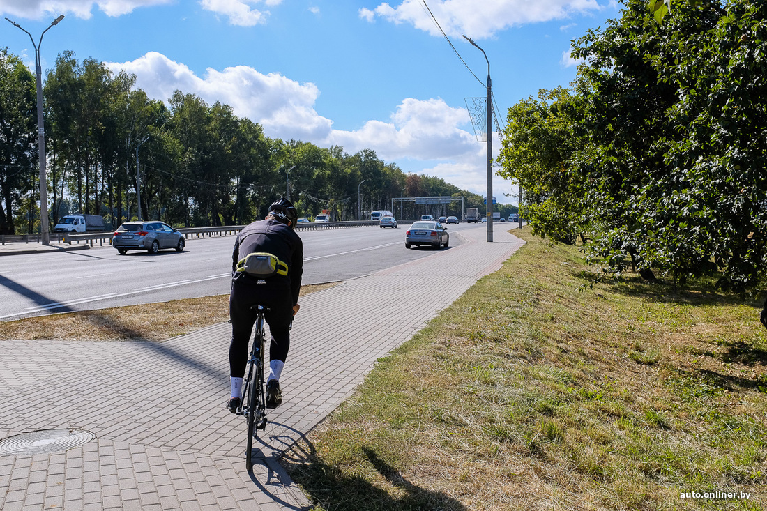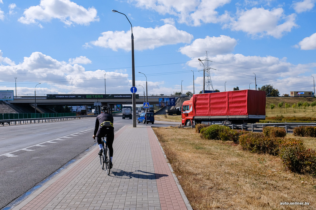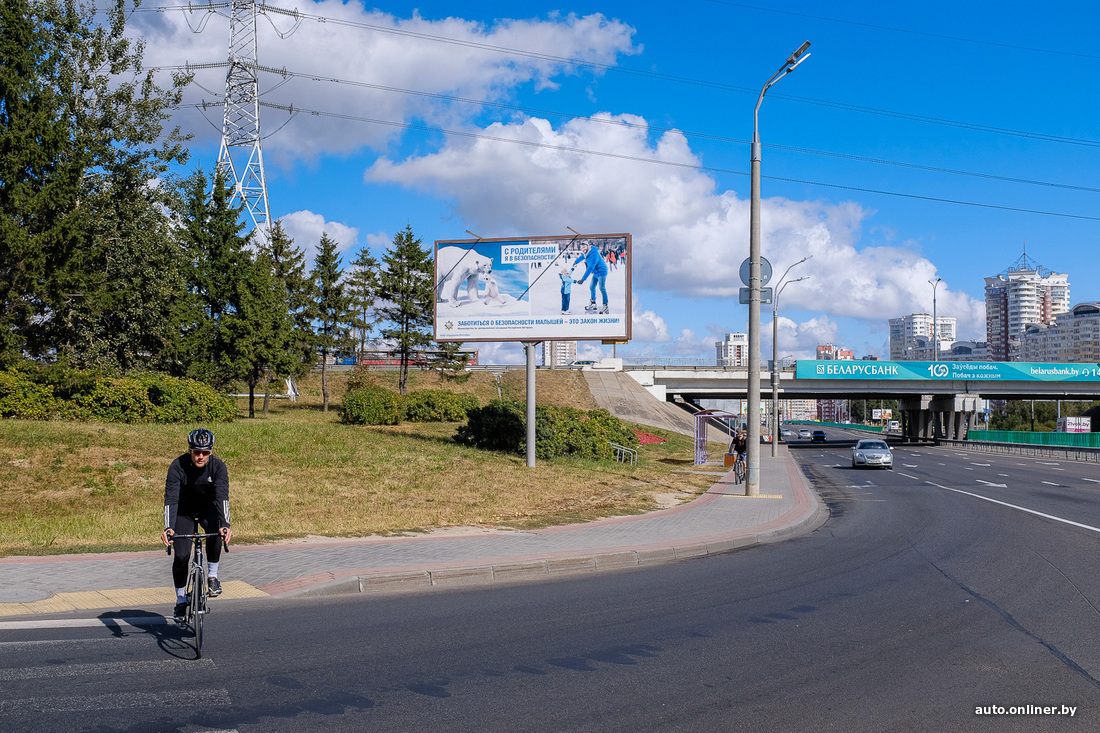 Одна из задач, которые всегда приходится решать, путешествуя из Минска, — как пересечь кольцевую. Иногда приходится делать изрядный крюк, чтобы маршрут был безопасным. Но на выезде с проспекта Дзержинского все обстоит проще: на съездах и выездах на двухуровневую развязку нарисованы «зебры», водители притормаживают, понимая, что обязаны пропускать. Играем в переглядки: да — нет? Пропускает — можно ехать.