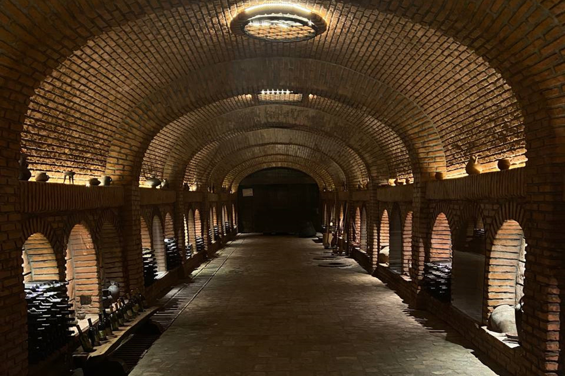 На следующий день решили прокатиться по Кахетии. Первой точкой была винодельня Хареба. Самое интересное — винный туннель, который прорублен в скале. Точнее, их там два, они соединены между собой множеством мелких туннелей. Ранее винные туннели принадлежали государству, сейчас приватизированы. После экскурсии можно подняться на вершину скалы, откуда открывается невероятный вид на близлежащие окрестности. На вершину можно подняться на лифте прямо из скалы или на электробусе по склону.
