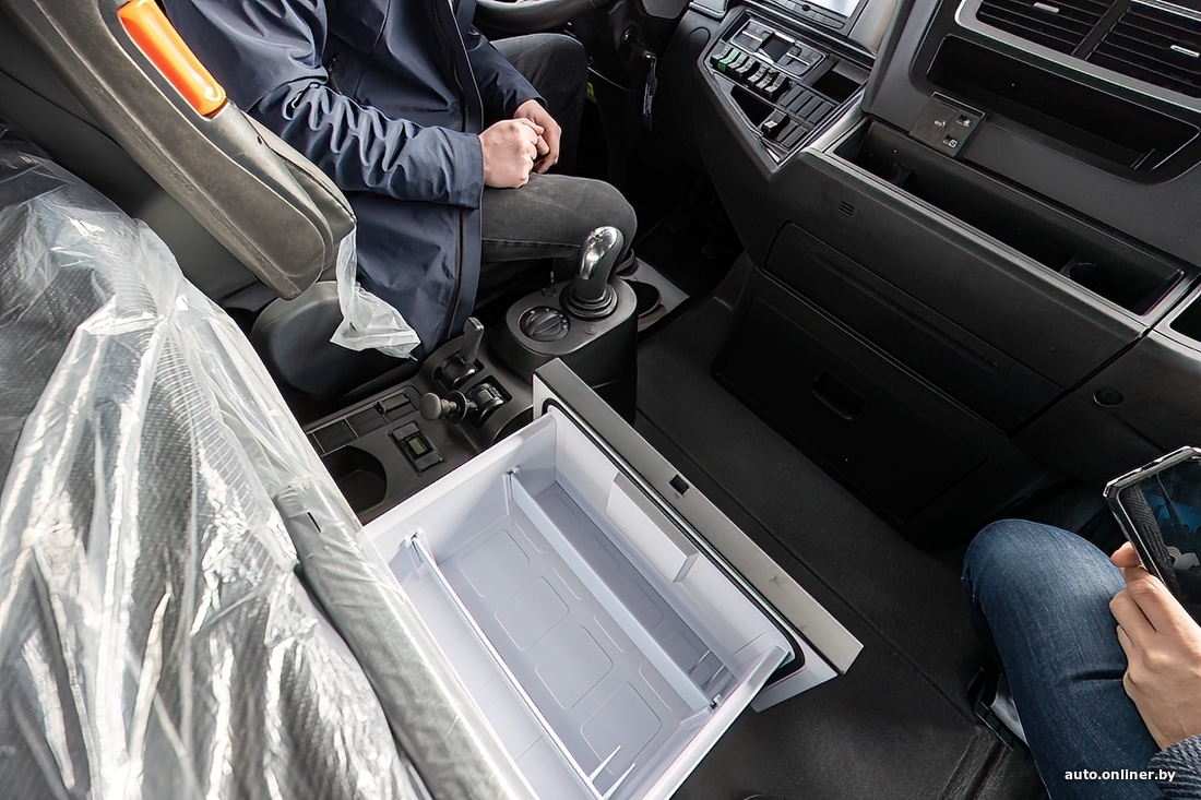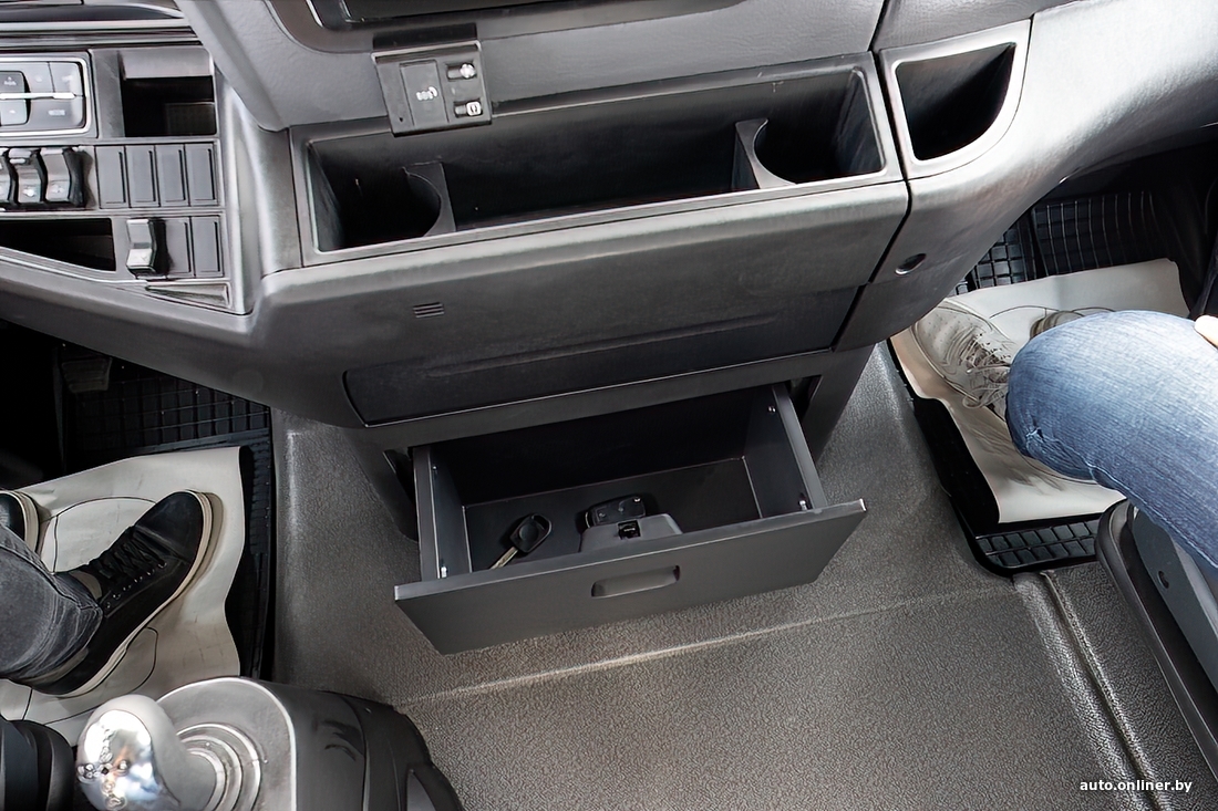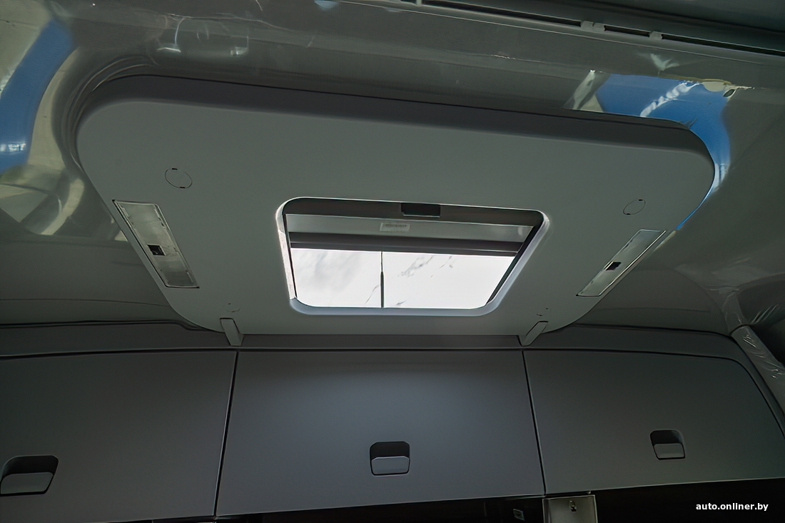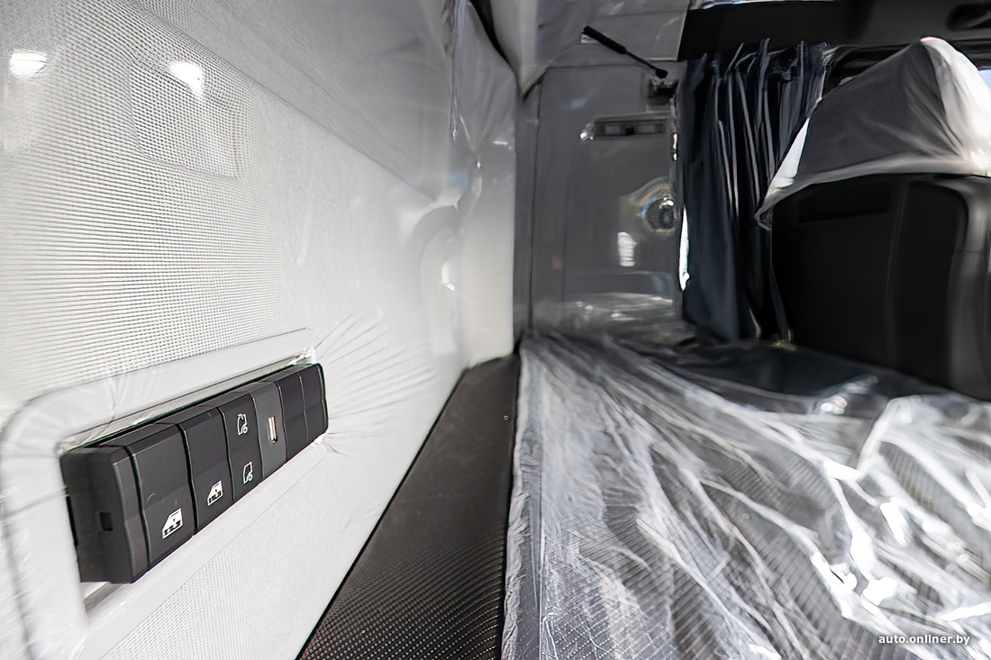 В средневысокой кабине предусмотрено два спальных места, оба с реечным ортопедическим каркасом. Под нижней спальной полкой спрятан выдвигающийся холодильник. Сиденья — с подогревом, оборудованы пневматикой. По периметру кабины есть много ящиков. Предусмотрен и люк с электроподъемником. В базовой версии установлен климат-контроль (не кондиционер). Дефлекторы обдува расположены на двери, направляют поток воздуха параллельно боковому окну.