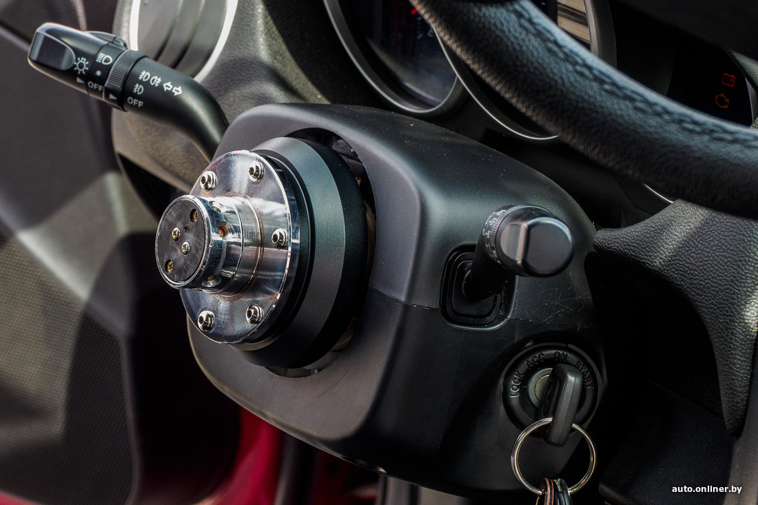 Безусловно, внимание привлекает руль. Это быстроcъем от Sparco. Эмиль установил его специально, чтобы можно было легко сесть в машину, при этом сохраняя спортивную посадку. Внутри конструкции крепления руля восемь шариков, при защелкивании они впадают в пазы и за счет нескольких точек опоры фиксируют рулевое колесо намертво.