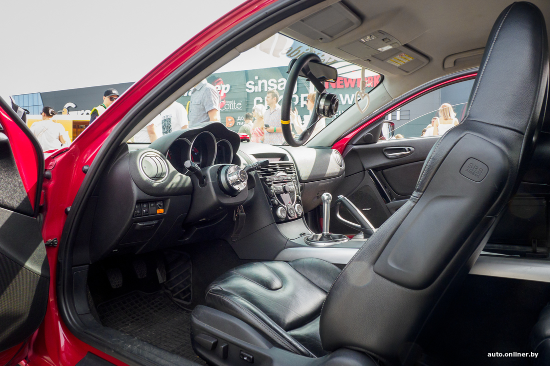 В итоге всю эту комплектацию удалось собрать из трех доноров. Из одной RX8 перекочевали части салона, пластиковые элементы. В салоне каждая мелочь, каждый вентилятор в идеальном состоянии, без трещин и потертостей. Сиденья черные, из самой дорогой комплектации, они не перешиты, в оригинальном состоянии, с подкачкой и поясничной поддержкой. Водительское место — с электронной регулировкой, пассажирское — с механической. Из богатой комплектации перекочевали подогрев зеркал и заднего стекла, электрорегулировки зеркал и боковых стекол, центральный замок, акустика.