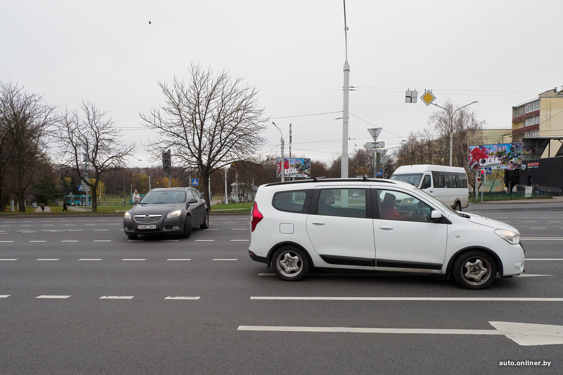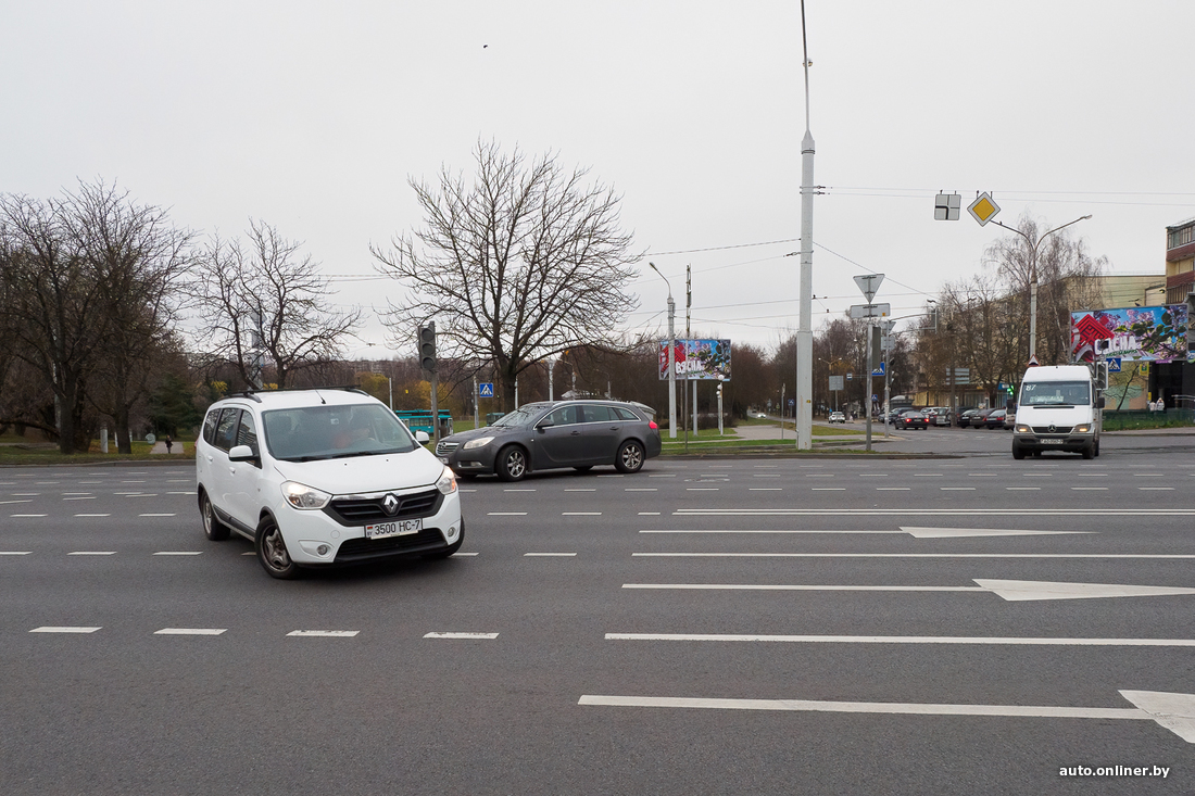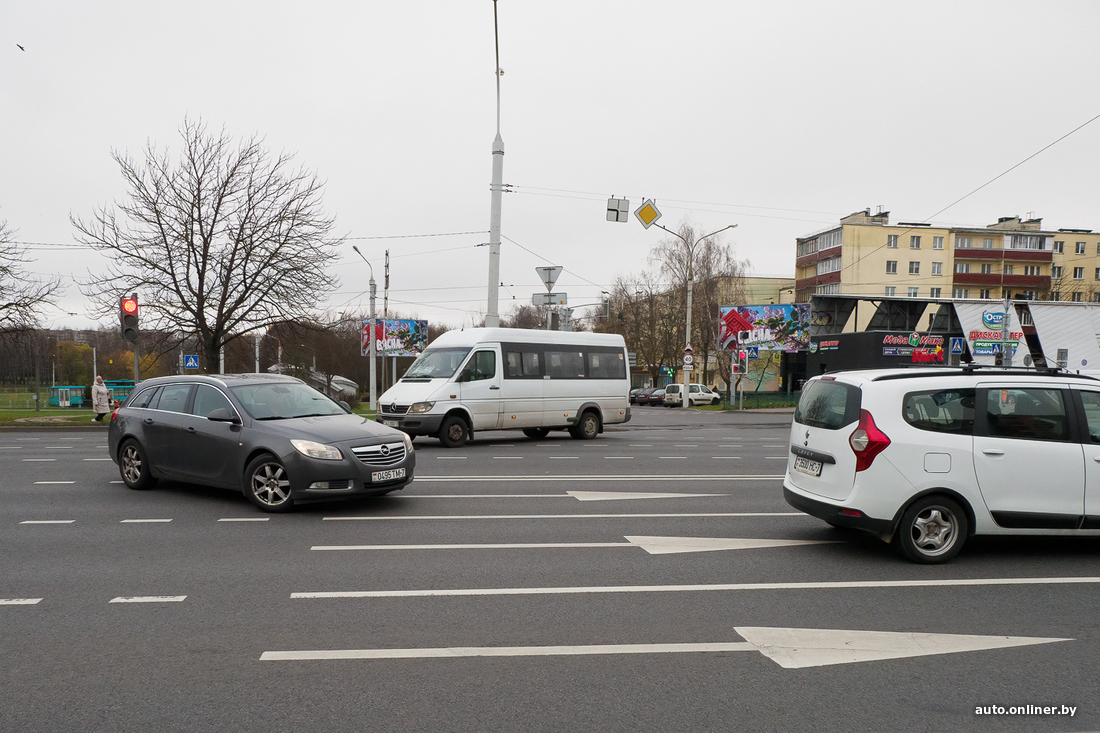 — Мне нужно повернуть налево, никакого запрета нет. Тот, кто проезжает здесь впервые, может не понимать, что у него впереди. Он видит проезжую часть Логойского тракта, видит, что там есть какая-то разметка, выезжает, а там двойная сплошная — вот те раз! А я поеду так, как мне действительно положено ехать, — говорит преподаватель и выворачивает руль вправо, проезжает вперед и только затем начинает поворот налево. — А вот смотри: автобус по встречке едет!