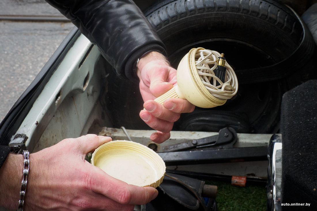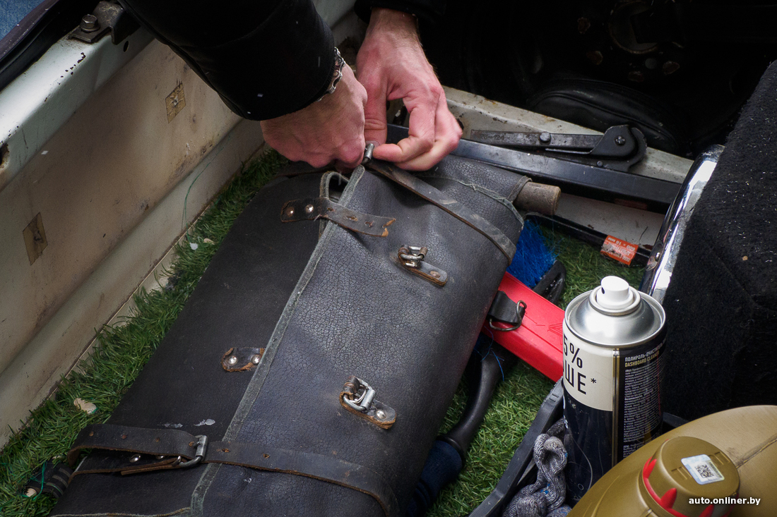 Что-то сломалось в замке крышки багажника: теперь он открывается нажатием сверху. «Чинить я это не буду, потому что стало только лучше», — признается Вячеслав. В багажнике — оригинальная сумка с лампой-переноской и насосом, а также винтовой домкрат. Кстати, с помощью последнего мужчина «переобул» машину к зиме.