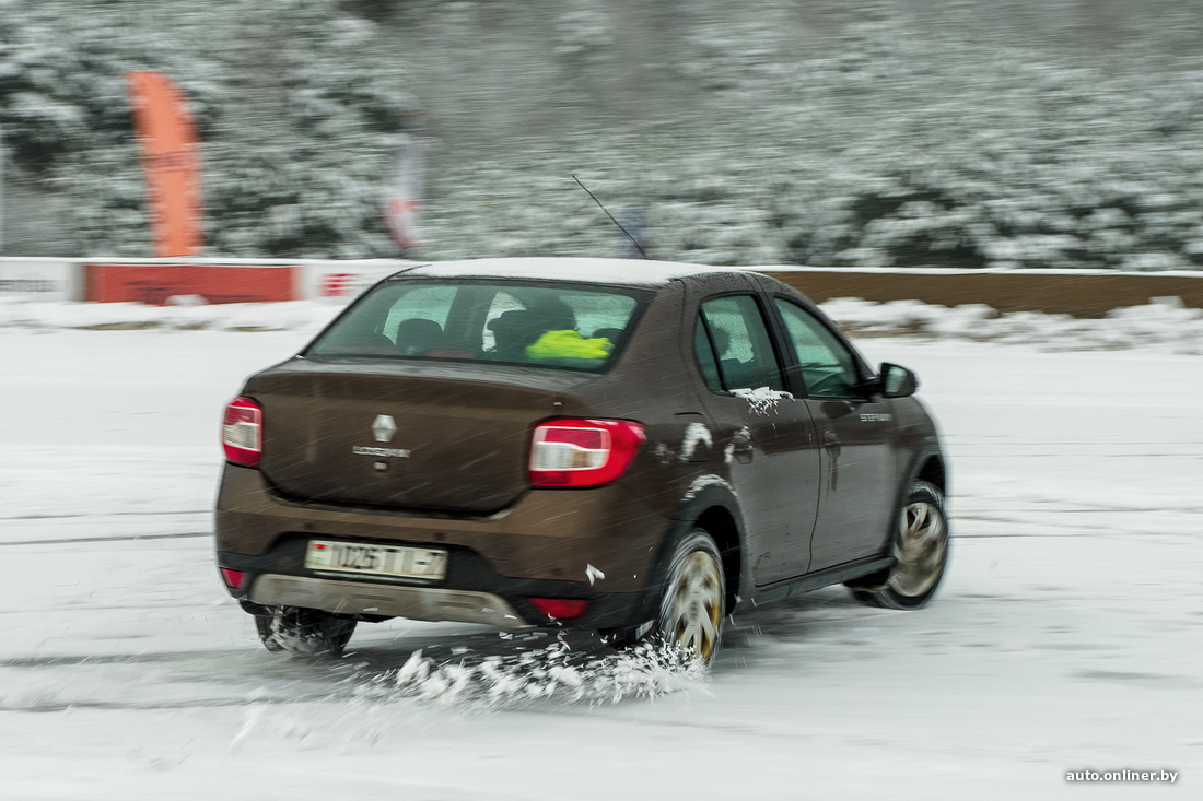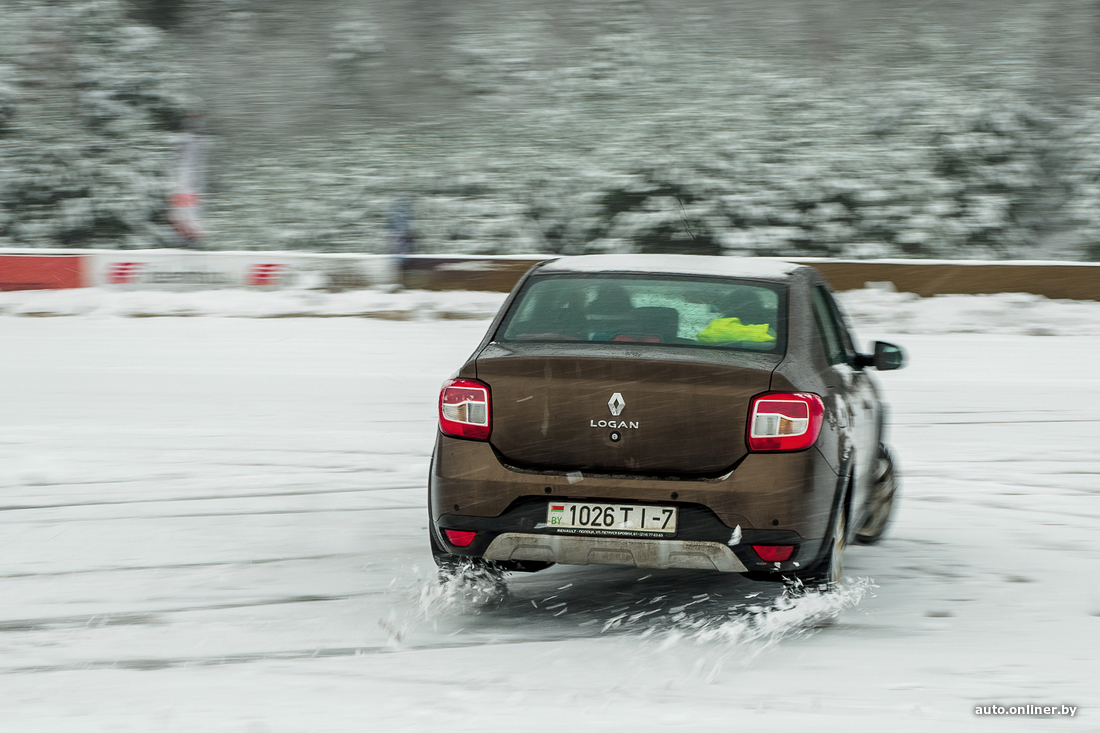 Начинаем на «Логане», чтобы сразу хапануть адреналина. Что сказать: не разочаровали ни чудо-машина, ни чудо-водитель — хапанули сполна. На заснеженной площадке, состояние которой запросто можно сравнить с нечищенной дорогой в условиях достаточно интенсивного снегопада, хватало буквально единственного нарочито неловкого движения рулем, чтобы автомобиль разворачивало боком и несло. Причем будь это дорога, несло бы первым делом на встречку. Краснов явно получал от этого удовольствие.