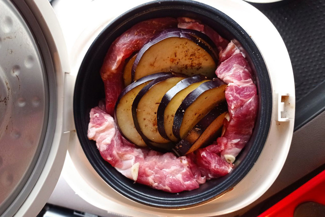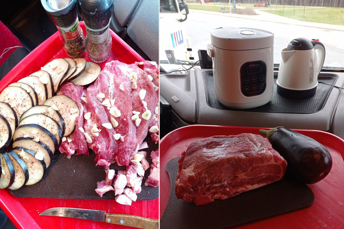 Тот самый DAF Тимофей оказался очень комфортным для передвижения на дальние расстояния. Большая кабина с кондиционером: зимой тепло, летом прохладно. Двухъярусная кровать. В дороге Чистики обычно готовят еду в мультиварке — есть специальные устройства на 24 вольта, работают от прикуривателя. Здесь хорошо готовятся самые простые блюда. Из последнего — мясо с баклажанами. Картофель во Франции стоит €3,5, поэтому предпочли на гарнир баклажан по €2 за килограмм. Кусочек свинины чуть более килограмма обошелся в €8,50. Александра тушит мясо в мультиварке 50 минут и оставляет еще на полчаса, чтобы оно постояло как в термосе. Готовый продукт получается нежным, а баклажаны не теряют формы, на вкус — «кремовые».