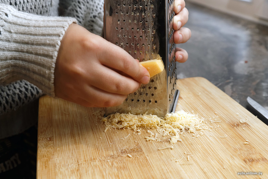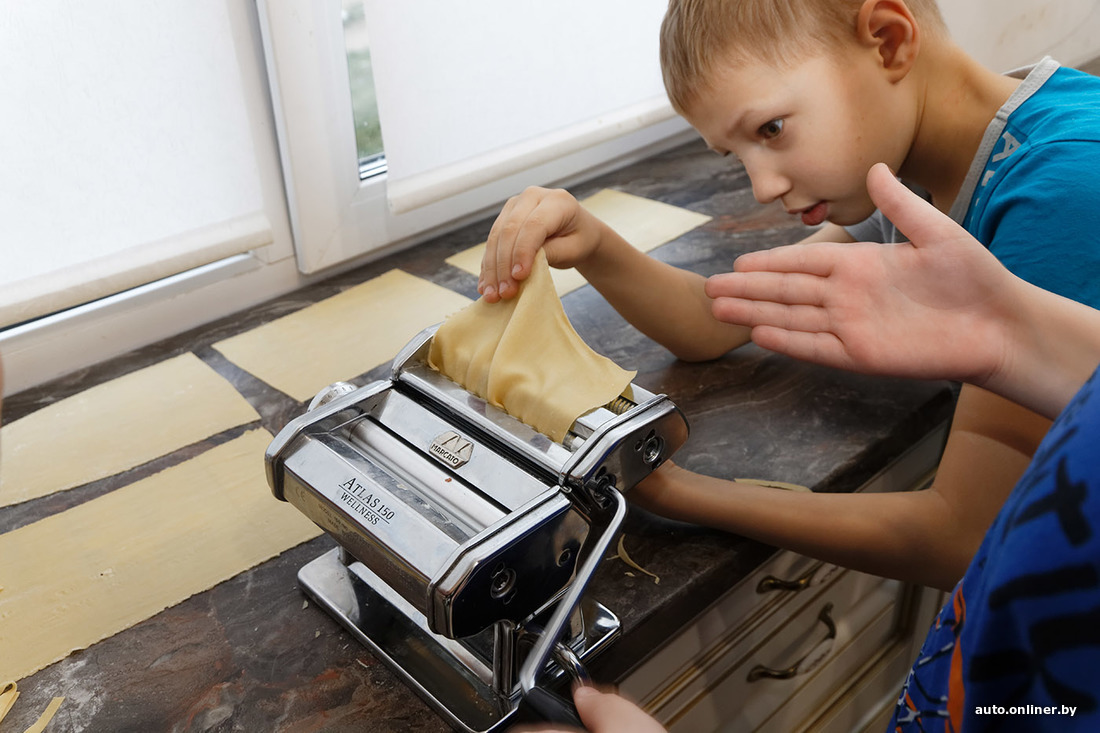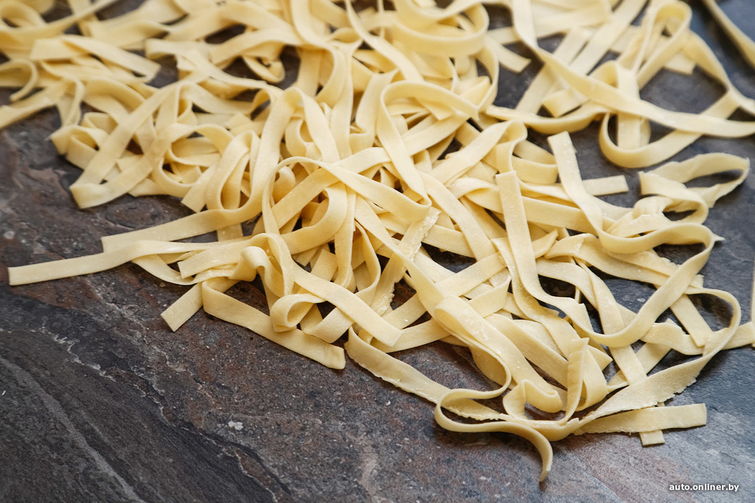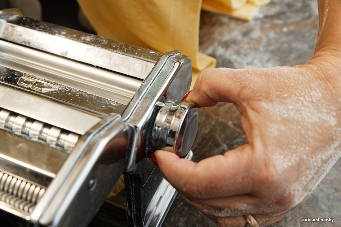 Сегодня взяла 500 граммов муки высшего сорта и, соответственно, пять крупных яиц. Пасту делаем на специальной машинке со смешным названием «тестораскатка». Для первого пласта устанавливаем колесико на нулевой отметке и прокручиваем половину теста. Дальше пропускаем получившийся пласт через тестораскатку еще три раза: на отметке «два», «пять» и «семь». В итоге получаем тонкое, но плотное тесто. Режем его как нравится: можно длинными пластинами, можно короткими — наподобие лапши. Меняем насадку на резку и режем аккуратно. Разбираем получившиеся полоски теста руками и оставляем немного заветриться. Если добавить воду, они будут нежнее, но и подсушивать придется дольше.