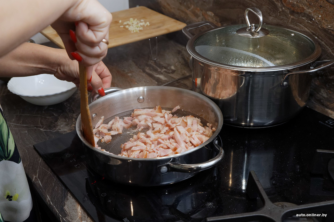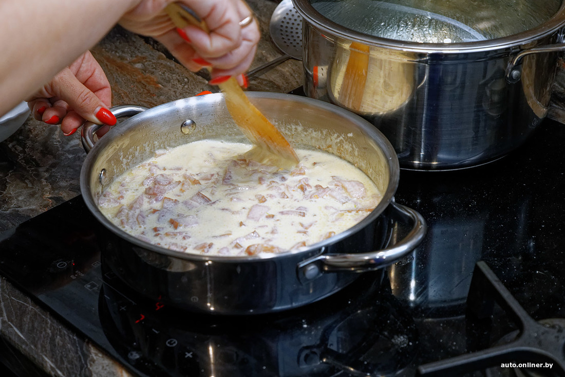 В это же время берем нарезанный заранее бекон. Люблю все делать на глаз, у меня тут около полукилограмма (то есть муку и бекон берем практически в равных пропорциях). Продавленный чеснок смешиваем с двумя 200-граммовыми упаковками сливок и выливаем в сковороду с обжаренным беконом. Закипело, чуть покипит, и выключаем.