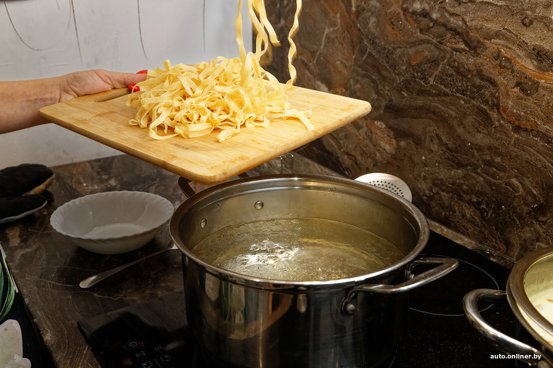 Пока паста отдыхает, ставим подсоленную воду. Заметили? В тесто мы не добавляли соли. Поэтому вода должна быть чуть пересоленной, чтобы продукт не получился пресным.