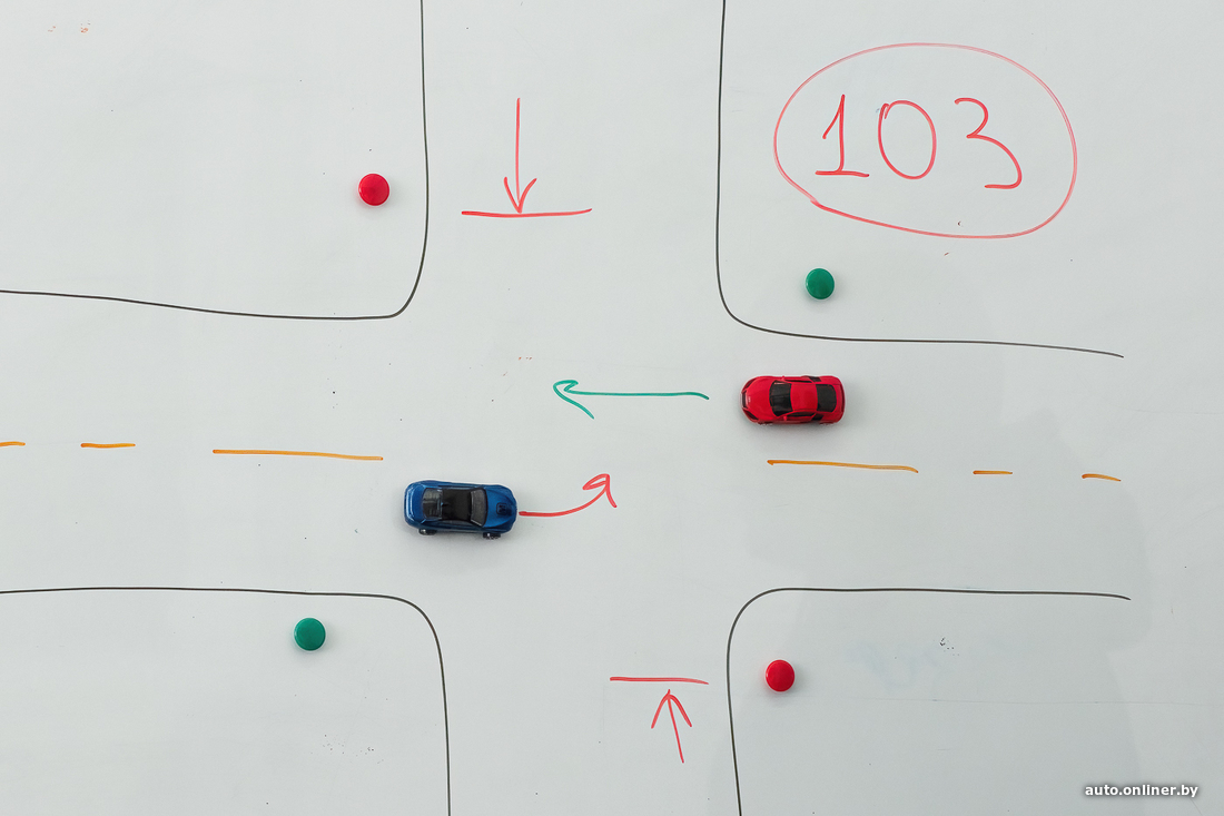 — Все к этому привыкли, все знают, как действовать в такой ситуации. И все привыкли к тому, что если горит зеленый сигнал светофора, то он одновременно горит и для встречного направления, — рассказывает преподаватель и чертит схемы на доске. — Но затем стали появляться перекрестки, на которых одним водителям горит зеленый свет, а встречному направлению загорается красный. И это называют отсечкой. Плюс такого решения очевидный: у водителей, которые хотят повернуть налево, в какой-то момент появляется возможность беспрепятственно это сделать, что удобно.