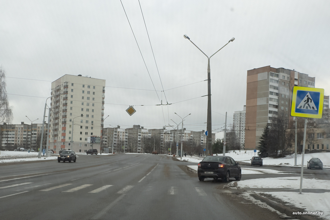 Кстати, катаясь через перекресток, мы обнаружили еще одну проблему. Едем по улице Академика Купревича, сворачиваем направо, на улицу Руссиянова. Для этого даже есть специальный проезд, но на выезде нет знака приоритета, никакого «Уступить дорогу», хотя он напрашивается.
