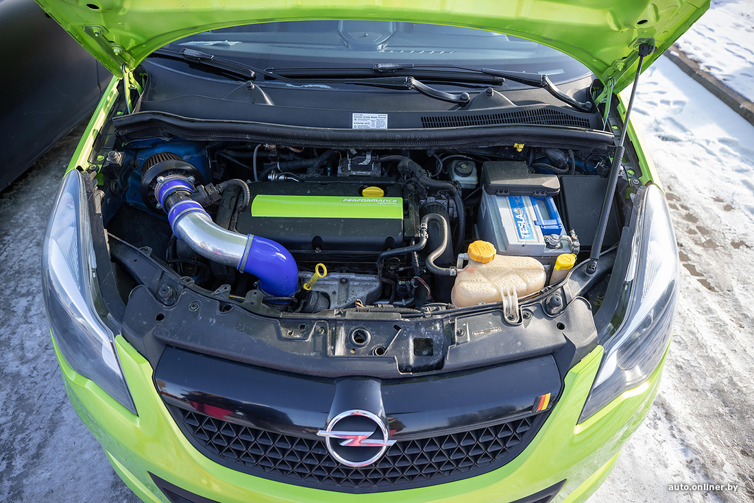 Opel Corsa GSi можно назвать самой младшей и упрощенной моделью в линейке. Перед нами рестайлинговое авто 2008 г. в.: фары и бампер не такие, как у стоящих рядом «опцэшек». 1,6-литровый двигатель Z16LEL более зажат — выдает по сравнению со своими коллегами лишь 150 л. с. с завода, но статус «заряженности» это не отменяет. Тем более владелец Андрей почти сразу после покупки выполнил прошивку Stage 1. Теперь под капотом 200 «лошадей».