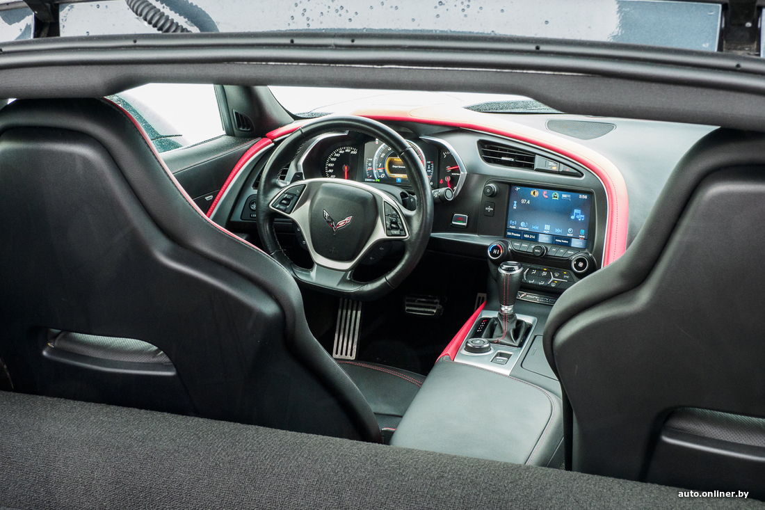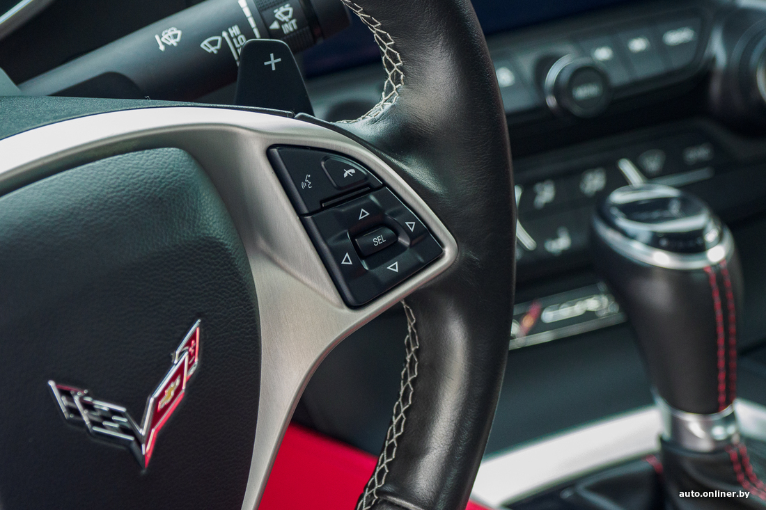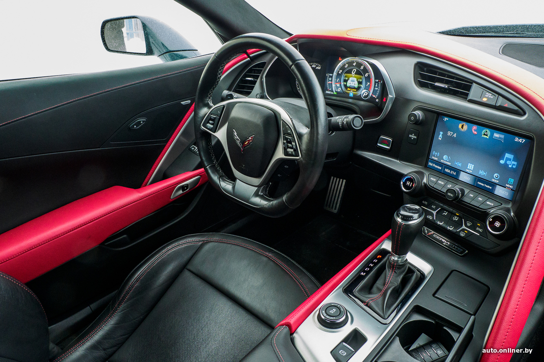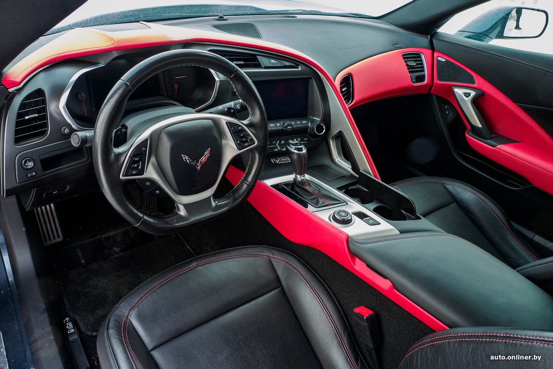 Вообще, Corvette C7 выпускался, так сказать, в два захода: с 2014 по 2017 год и с 2017-го по 2019-й. Нас интересуют последние из выпущенных, самые свежие машины. Заднеприводный автомобиль укомплектован мотором V8 объемом 6,2 литра и мощностью в 455 л. с. Он позволяет машине разгоняться от 0 до 100 км/ч за 3,8 секунды. Комплектация не может не впечатлить: АКПП, жесткая складная крыша, ковши Recaro с черной кожей отделки, красными вставками и красной строчкой, акустика BOSE, черный потолок, электрорегулировки сидений, дистанционный запуск двигателя, подрулевые лепестки КПП, камера заднего вида, система активной помощи при парковке, электронные ассистенты помощи водителю...