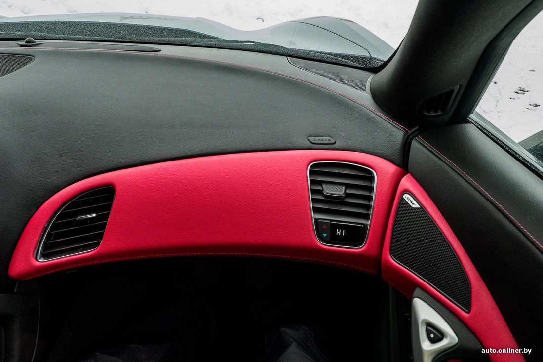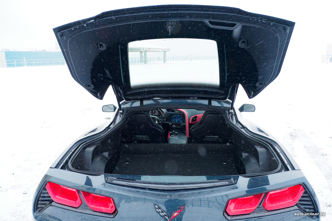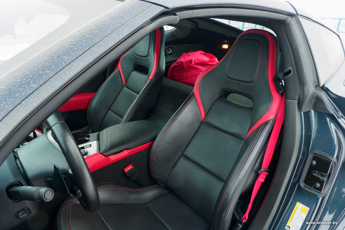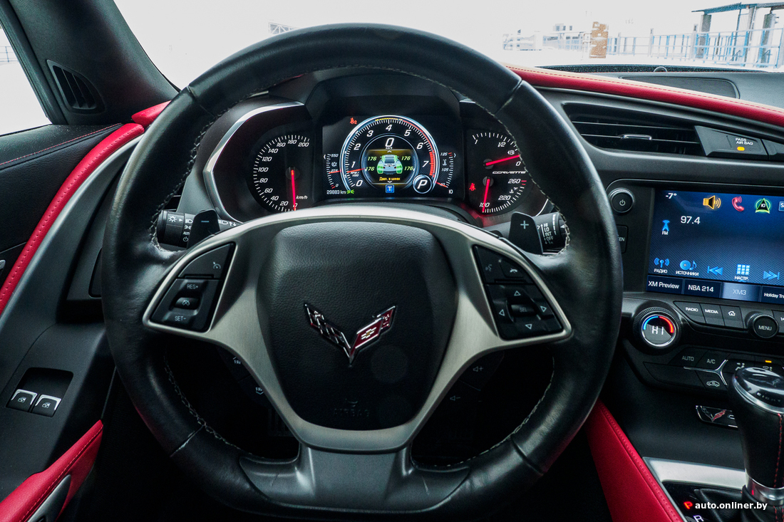 Вообще, Corvette C7 выпускался, так сказать, в два захода: с 2014 по 2017 год и с 2017-го по 2019-й. Нас интересуют последние из выпущенных, самые свежие машины. Заднеприводный автомобиль укомплектован мотором V8 объемом 6,2 литра и мощностью в 455 л. с. Он позволяет машине разгоняться от 0 до 100 км/ч за 3,8 секунды. Комплектация не может не впечатлить: АКПП, жесткая складная крыша, ковши Recaro с черной кожей отделки, красными вставками и красной строчкой, акустика BOSE, черный потолок, электрорегулировки сидений, дистанционный запуск двигателя, подрулевые лепестки КПП, камера заднего вида, система активной помощи при парковке, электронные ассистенты помощи водителю...