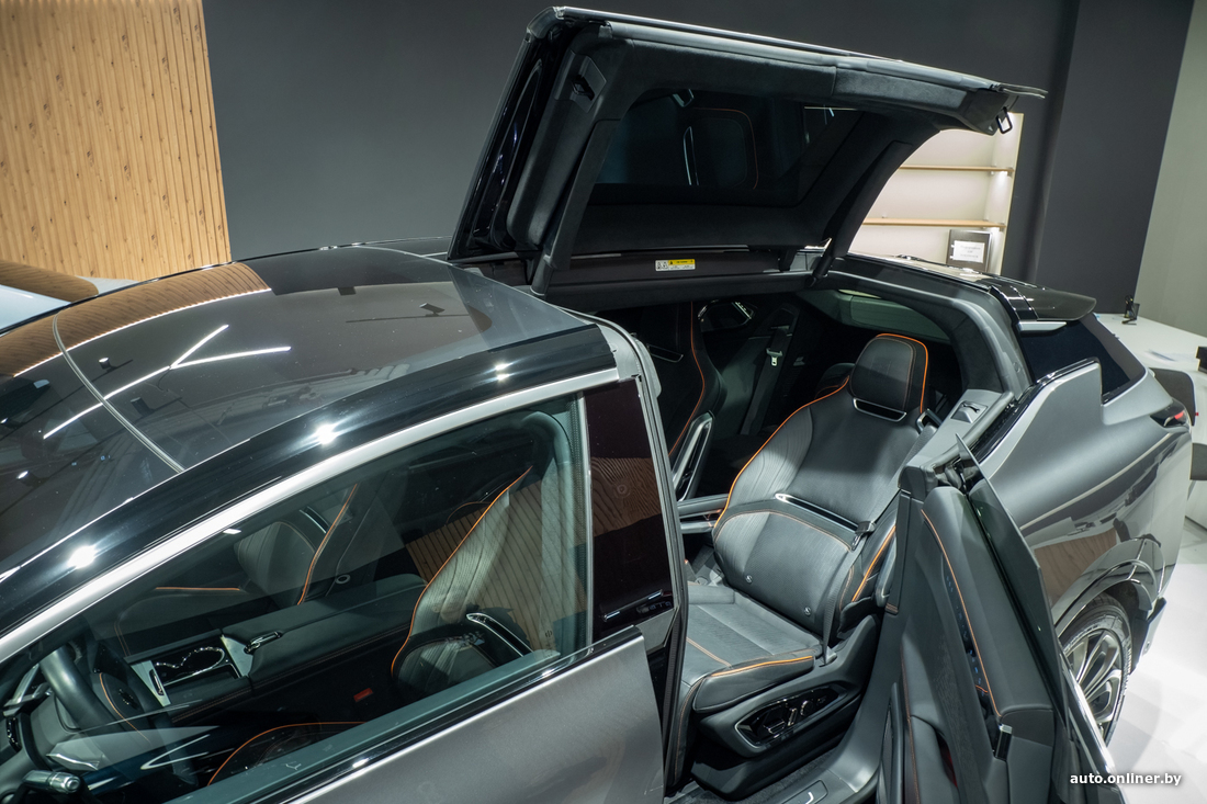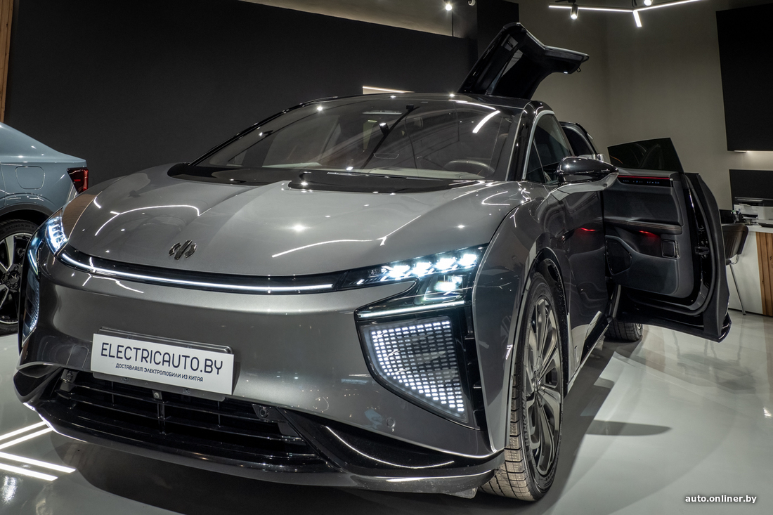 Самой дорогой из выставленных на продажу машин можно назвать HiPhi X — ее продают за $125 тысяч из расчета (346 тысяч рублей). Подробный обзор модели с пробегом по РБ можно найти здесь. Если кратко: в этом автомобиле предусмотрено 562 датчика, 307 приводов и бортовой помощник на основе искусственного интеллекта. И в целом машина умеет намного больше, чем мы привыкли ожидать от современного авто. По официальным данным, HiPhi X оснащен батареей емкостью 97 кВт·ч. Заявленный запас хода — 550 км. Все версии модели имеют два мотора. Топовая модификация может похвастаться отдачей 600 л. с. и крутящим моментом в 780 Н·м. Разгон до сотни — за 4 секунды. В шоуруме представлена шестиместная версия. Задние двери у автомобиля открываются против движения. Над ними есть еще небольшие поднимающиеся вверх поверхности, которые со стороны выглядят как крылья. Верхние «двери» предназначены для облегчения посадки на задний ряд. У электрокара нет дверных ручек, зато имеется система распознавания лиц.