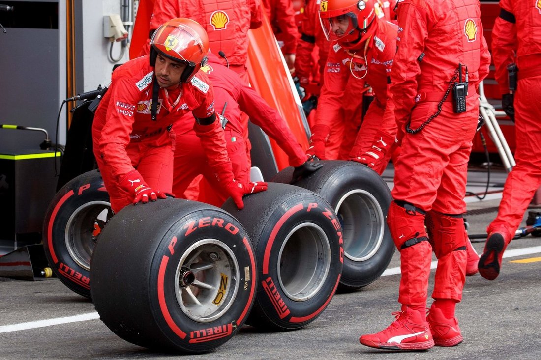 Как только болид остановился, двое механиков спереди и сзади поднимают его домкратами. В этот момент к работе приступает «шиномонтажная» бригада, состоящая из 12 механиков — по трое на каждое колесо: один работает с гайковертом, другой снимает колесо с изношенной резиной, третий устанавливает новую покрышку. Как только замена колес завершена, механики нажимают кнопку на гайковертах, подавая сигнал, что гайки надежно зафиксированы и машину можно опустить с домкратов.