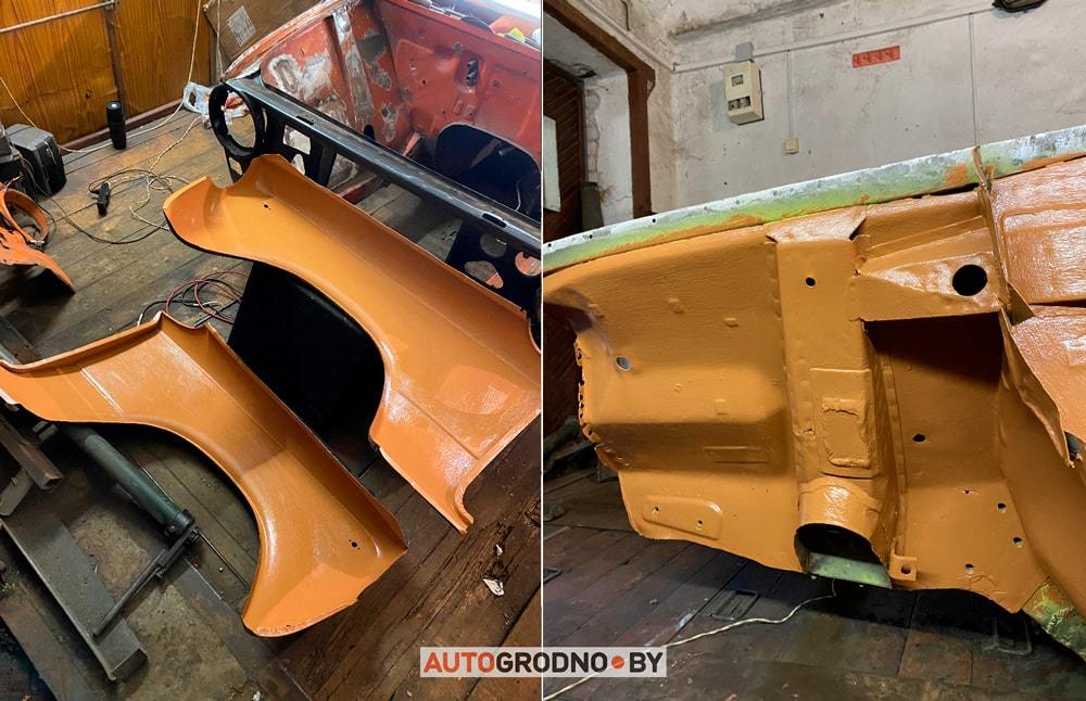 Все арки зачистил до голого металла и обработал в несколько слоев. Кстати, будет еще и финальный слой обработки, когда закончу со всем остальным. Те элементы, которые можно было восстановить, отдавал на пескоструйную обработку, а затем красил. Переварили переднюю часть. Заварили все лишние отверстия под капотом — будет шейвинг. Теперь начал собирать подвеску. Сейчас машина уже стоит на колесах. Впереди подготовка к перекраске. Кузов будет одного цвета, а подкапотка — другого. Надеюсь, сочетаться будут отменно.