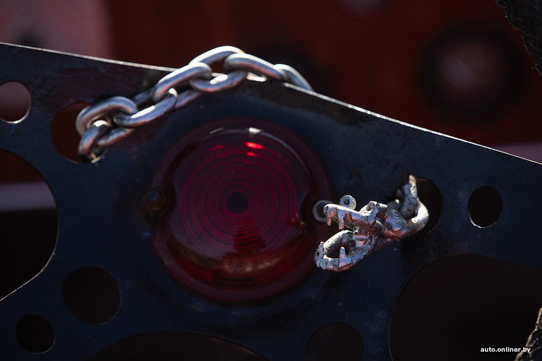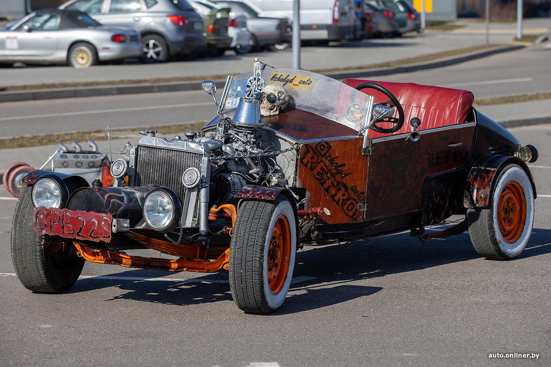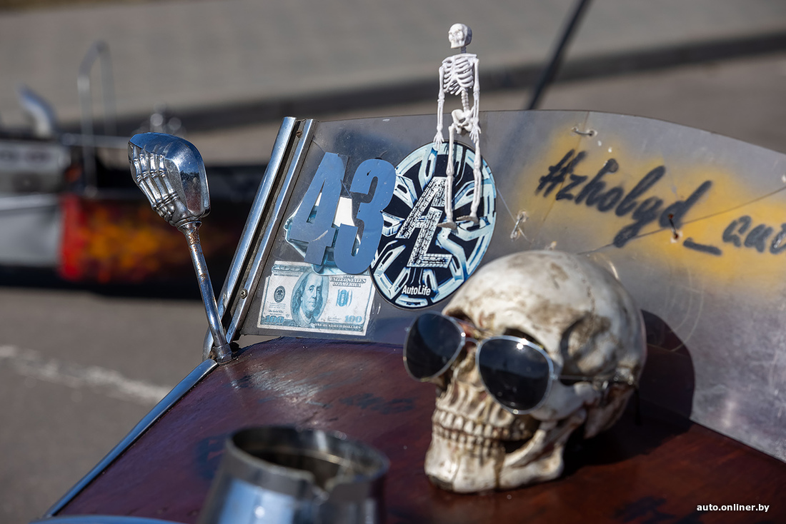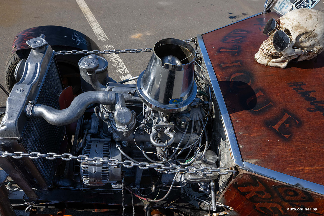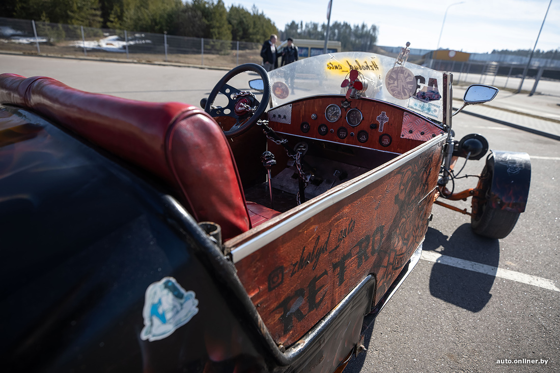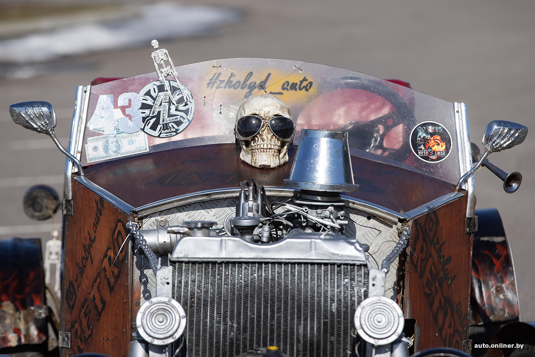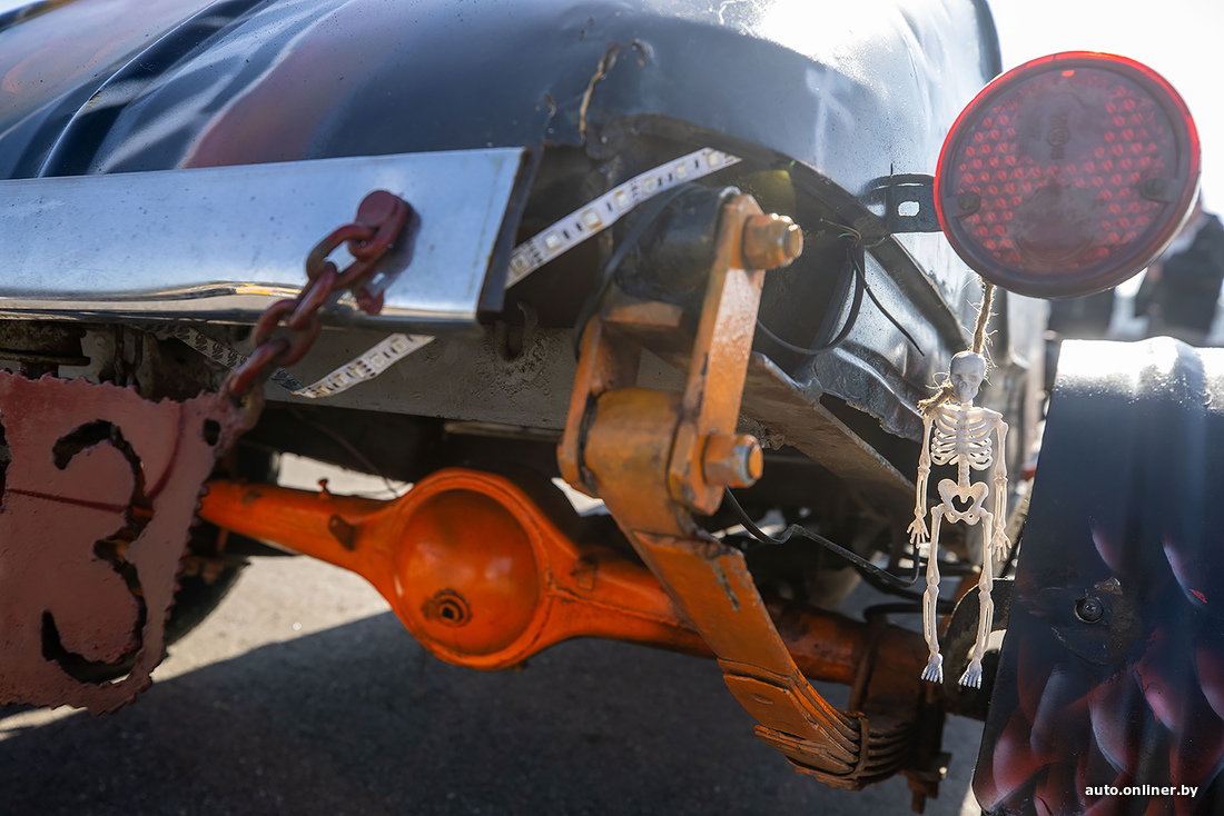 «Кстати, второй по популярности вопрос — а есть ли у нее документы, можно ли ездить по дорогам? Нет, документов нет, по дорогам нельзя, поэтому по выставкам хот-род ездит исключительно на прицепе. Можно ли как-то „легализовать“? В теории можно — сертифицировать через НАН РБ. Однако для этого нужно, чтобы самодельный автомобиль был собран из современных узлов и агрегатов. Особенно касается тормозной системы и управления. Но это, согласитесь, будет уже совершенно другой проект. Нам же хотелось сохранить дух классических хот-родов, со всеми специфическими моментами: карбюратор, подвески и так далее».