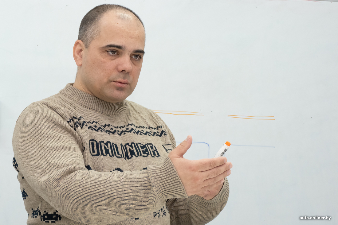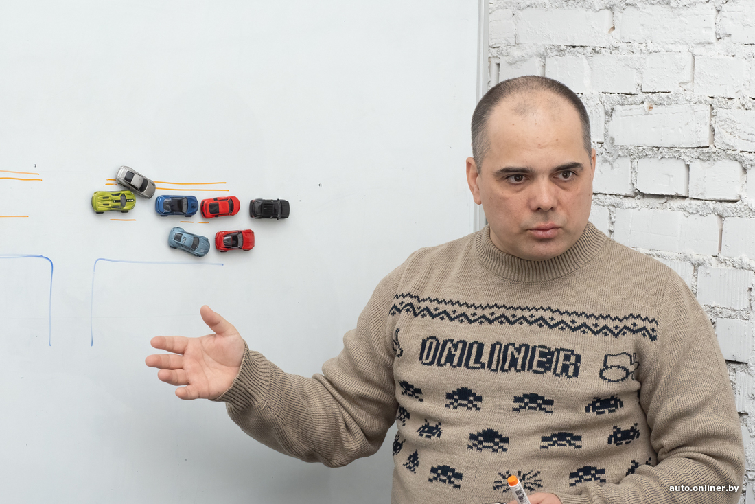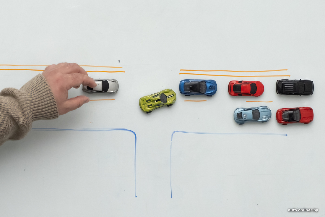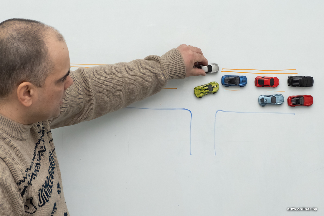 — Они ведь ехали с одинаковой скоростью, — рассуждает инструктор, схематично изображая ситуацию на доске. — Автор видео ехал тихонько, сбоку от него двигалась другая машина. Из этого следует, что автомобиль, с которым потом произошло столкновение, тоже перемещался с небольшой скоростью.