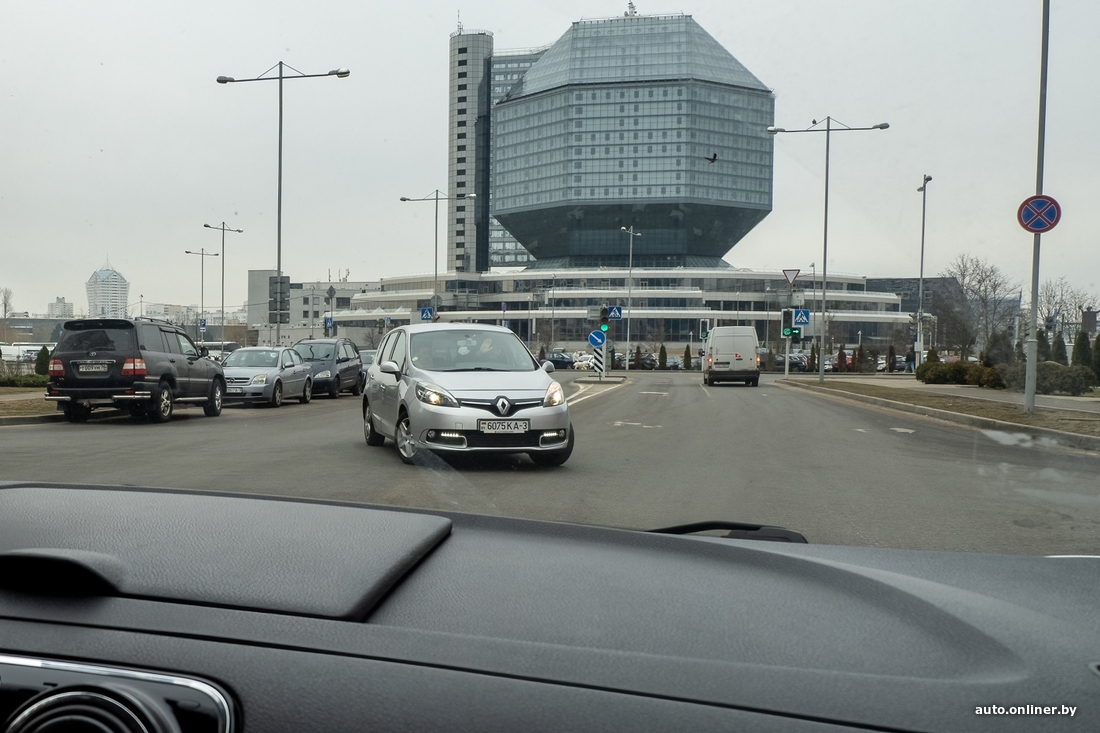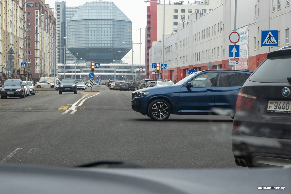 За беседой мы сами не заметили, как приехали в «Маяк Минска». Улица Петра Мстиславца с тыльной стороны торгового центра. Сразу понятно, где главная дорога, а где второстепенные выезды, которых множество. Плюс автомобили, которые припаркованы вдоль проезжей части. Припарковаться-то он припарковался, а как выехать, когда поток нескончаемый?