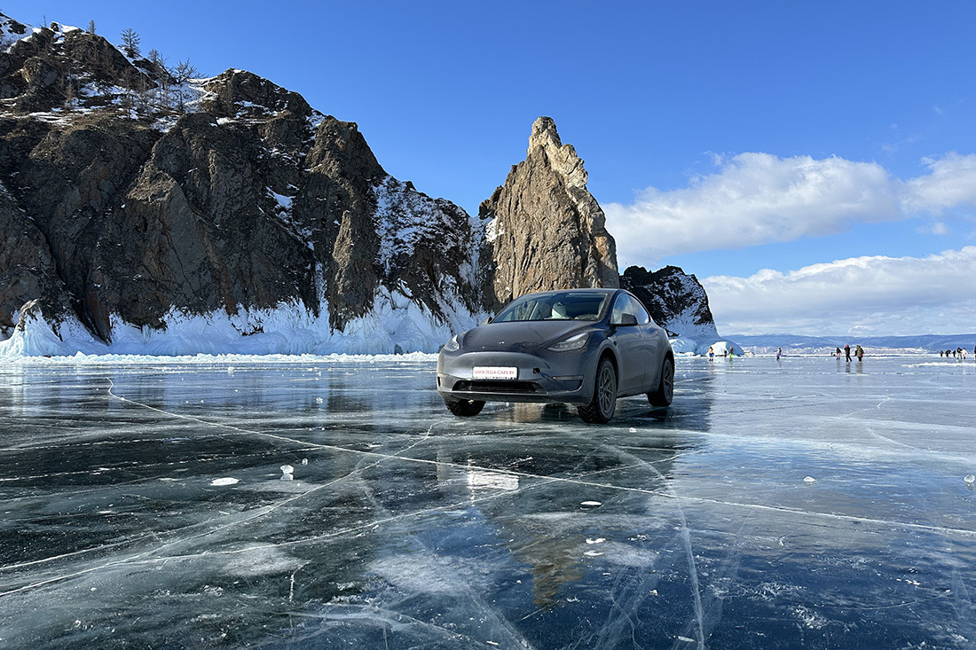 В качестве электрокара для этой миссии выбрали подготовленный для бездорожья и офроуд-соревнований Model Y, который мы называем «Чебуратор». На авто с малым клиренсом и неподготовленной подвеской лед Байкала не пересечь.