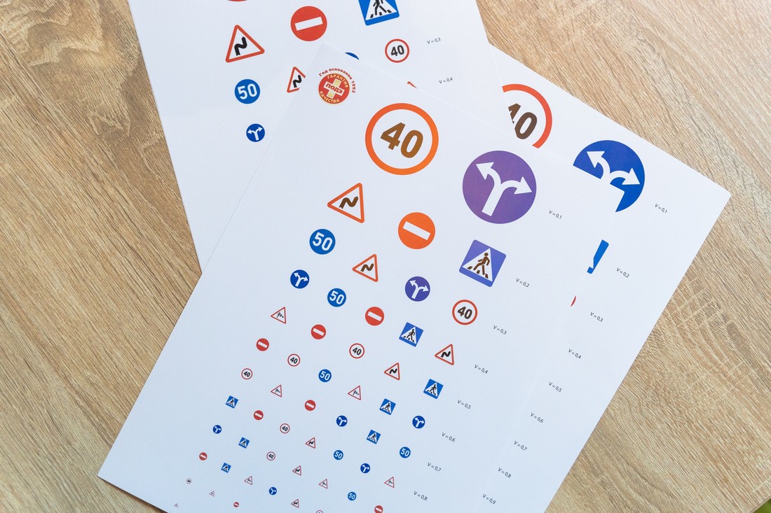 Табличка, как и в традиционном варианте, имеет 12 строк с символами: самые мелкие — внизу, а крупные — вверху. Только вместо букв используются дорожные знаки. Инициатива принадлежит специалистам Центра офтальмологии и микрохирургии глаза «Лодэ», они же рассказывают подробности эксперимента: