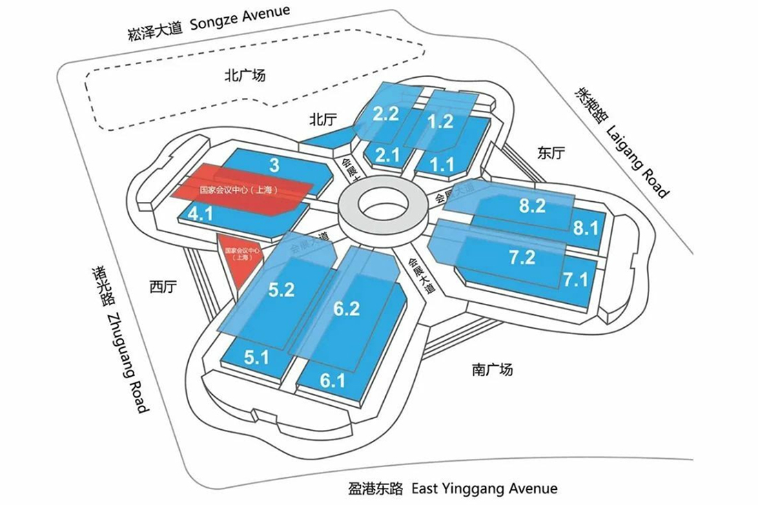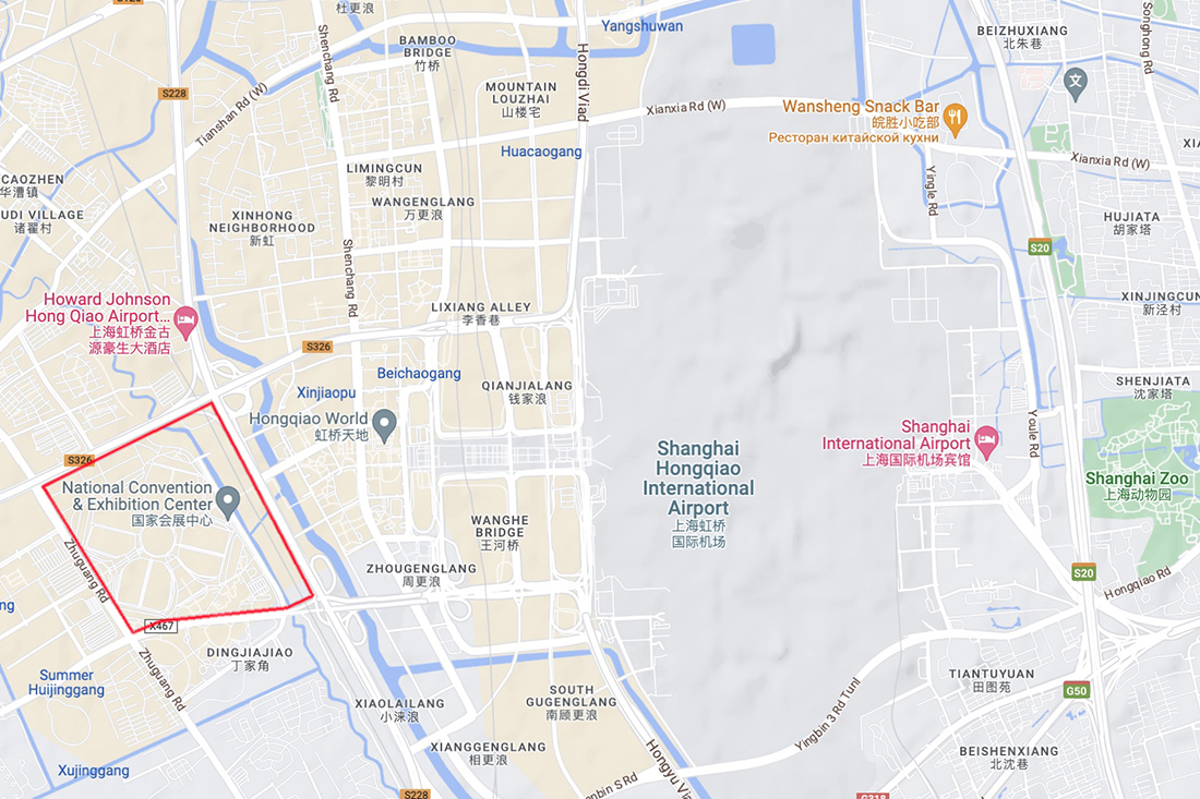 Производители автомобилей, запчастей и оборудования заняли семь из восьми павильонов огромного двухэтажного Национального выставочного центра Шанхая в форме четырехлистника. Чтобы представлять размах, сравним территорию этого здания с разместившимся неподалеку аэропортом — центр занимает примерно пятую часть аэровокзала. Для большего понимания приведем и схему половинки одного лепестка четырехлистника.