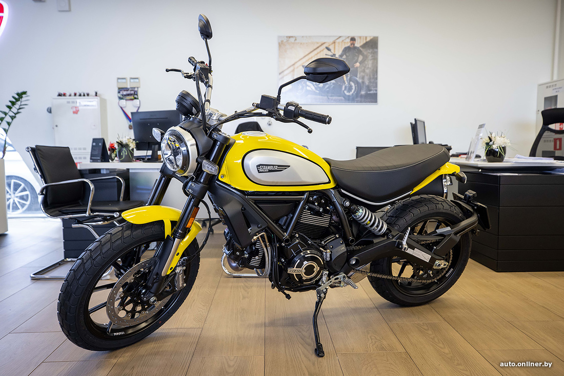 Следующая модель, выполненная под классику, — это Scrambler с двигателем на 800 кубиков (стоимость — €17 000). Подходит больше для новичков — мотоцикл легкий, хорошо управляемый и предсказуемый в движении и торможении (стоят премиальные тормоза Brembo). Неплохой вездеход — шины у него «шашечкой». Можно съехать с асфальта в лес к речке, например. Есть модель в желтом цвете.