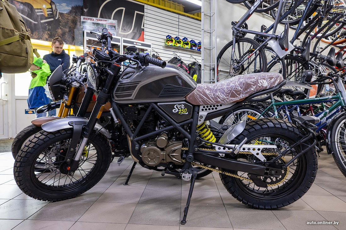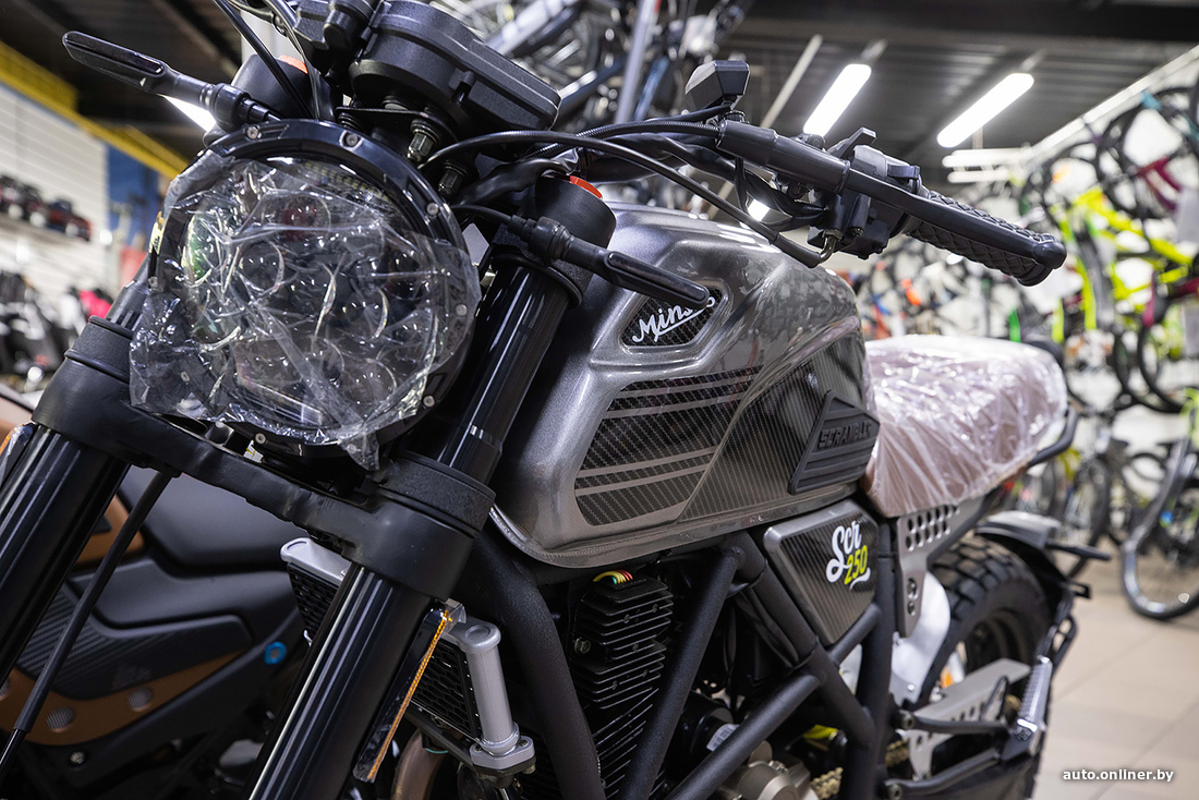 Также в салоне нашлись уже известные модели: инжекторный скремблер (то есть байк двойного назначения — и для города, и для небольшого бездорожья) SCR 250 стоит 7400 рублей (почти $2600).