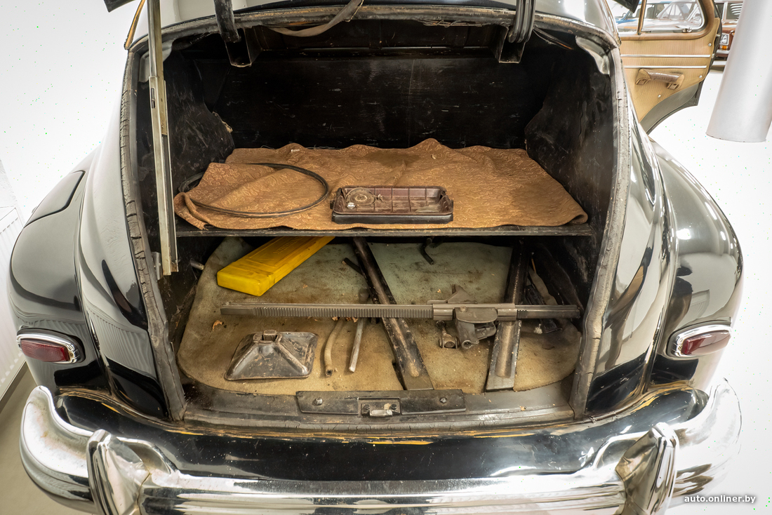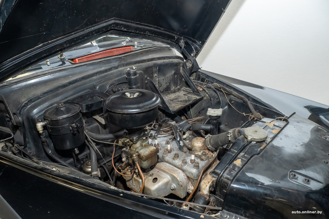 Мотор здесь четырехтактный, карбюраторный, с четырьмя цилиндрами, объемом 2,12 литра и выдающий 50 л. с. при 3600 об/мин. По тем временам полсотни «лошадок» были довольно немалым показателем. Высота багажника предусматривает возможность захватить с собой несколько канистр с топливом — машины тех лет были весьма прожорливыми.
