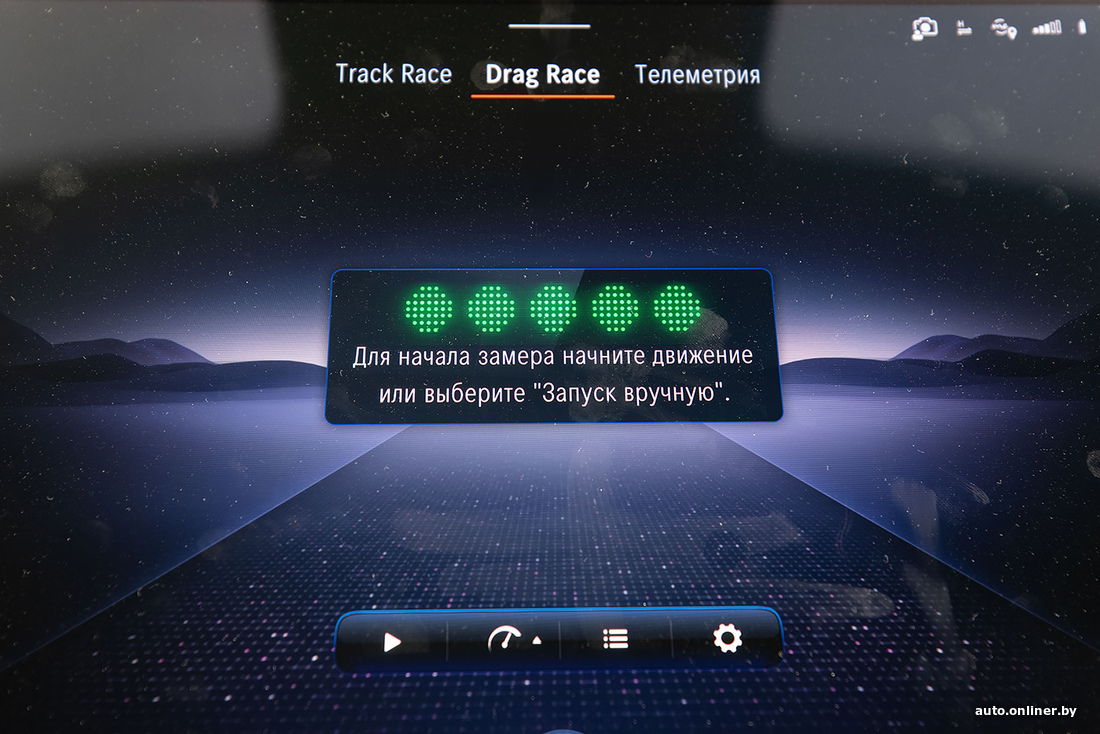 Еще одна функция — это драг-рейсинг. Этот электрокар позволяет стартовать «в две педали»: активировав нужный режим, вы нажимаете обе педали и ждете, пока на центральном экране загорится разрешающий сигнал стартового «светофора». После этого пилот просто отпускает педаль тормоза — и получается максимальное ускорение. При этом электроника зафиксирует время реакции, что очень важно в соревнованиях по драг-рейсингу.