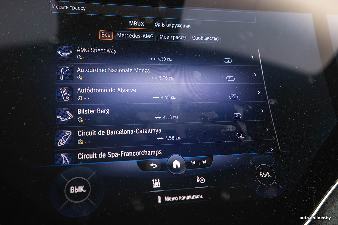 Ну и для тех, кто любит гонки не только по прямой, AMG припасли еще пару приятных сюрпризов. Во-первых, в ее навигации зашиты карты популярных гоночных трасс, так что если вы когда-нибудь окажетесь, к примеру, на «Хунгароринге», сможете быстрее освоиться на треке и показать достойный результат.