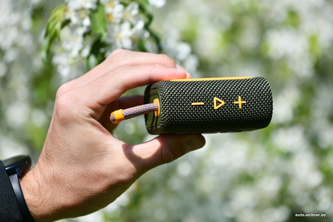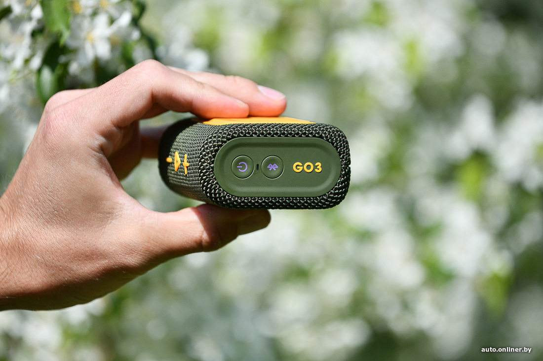 Модель JBL Go 3 — самая яркая колонка из всего квартета, которые были у нас в поездке. И это имеет значение: в любой ситуации рука сначала тянулась к ней — на заметку маркетологам. Она обтянута приятной на ощупь и кажущейся прочной тканью, поверх которой есть прорезиненные элементы контрастного цвета. Модель удобно держать в руке, ее можно поставить или положить на поверхность — она не соскользнет, в общем, с первыми впечатлениями все отлично. Есть защита от влаги — под дождь с ней попасть не страшно.
