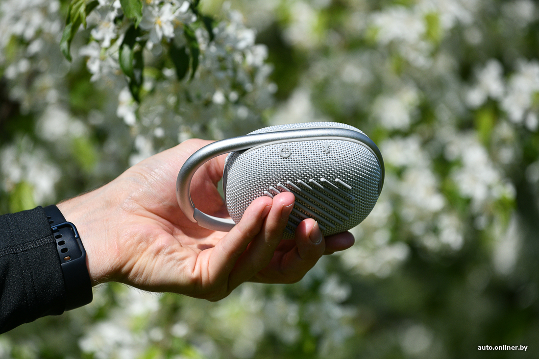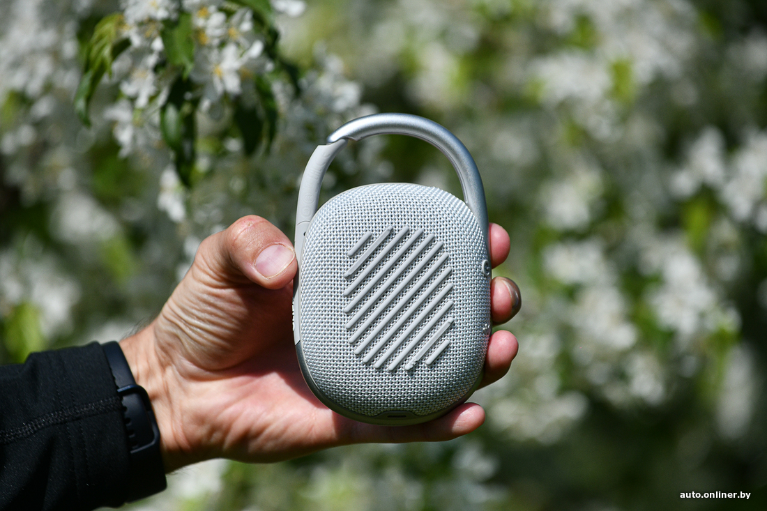 JBL Clip 4 сразу же выделяется на фоне остальных своим практичным исполнением. Это модель не с банальным «ушком», для которого еще нужно докупить карабин, а колонка с карабином, и это преимущество. Ее удобно крепить куда угодно — вы точно придумаете подходящий вариант.