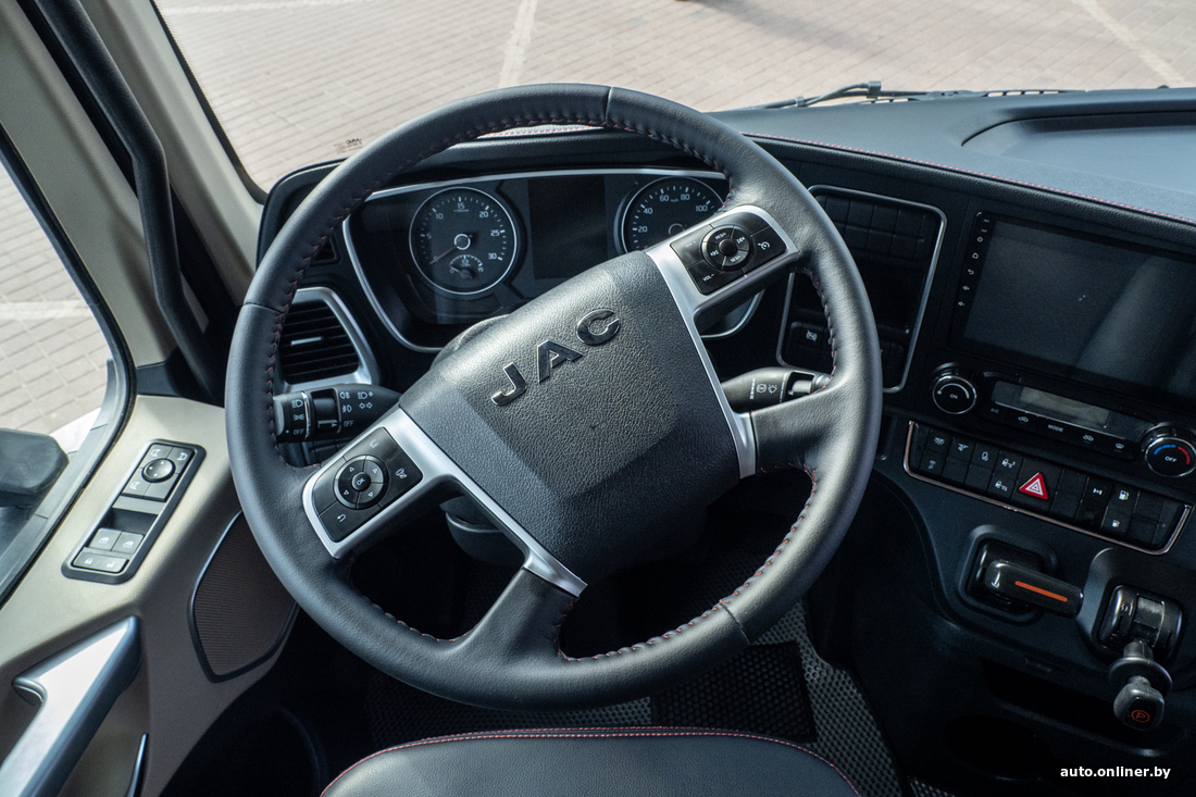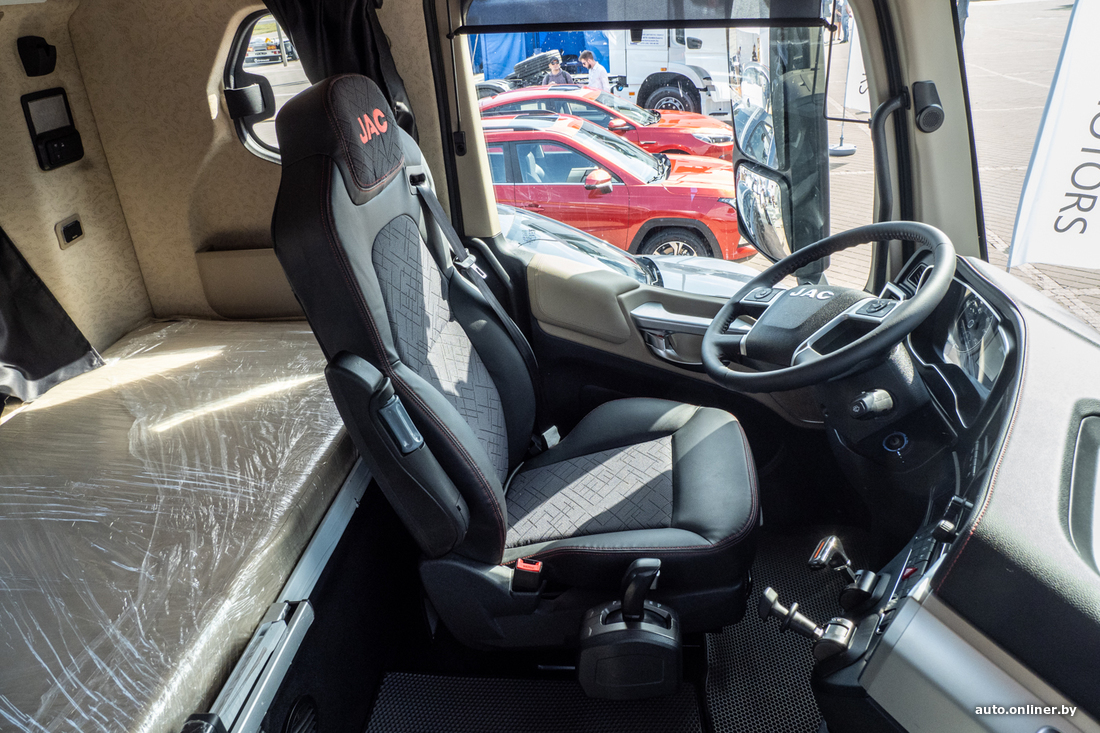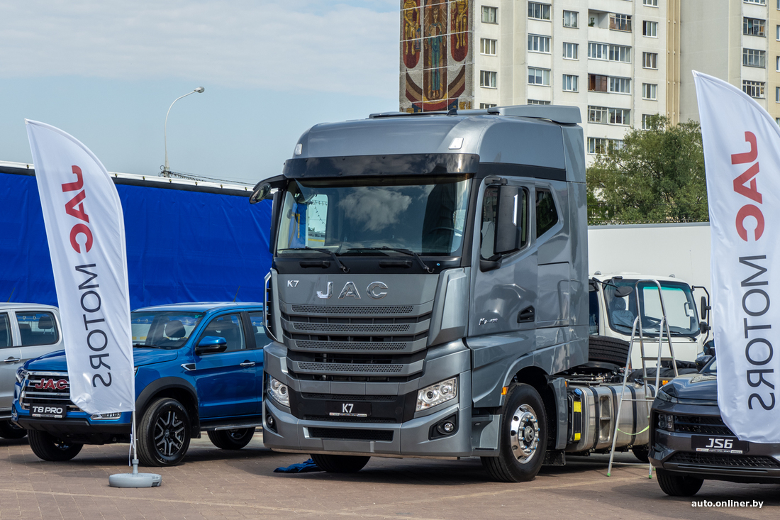 Кроме того, показали вживую и седельный тягач JAC K7. Его продажи уже стартовали. Он оснащен 490-сильным двигателем Cummins экологического класса Евро-5. Вес шасси составляет 7493 кг, объем топливных баков — 800 и 400 л. В кабине грузовика есть сиденье водителя с пневмоподвеской и электрические зеркала заднего вида с подогревом. Также JAC K7 имеет системы ABS/EBS/ESC, моторный тормоз и видеорегистратор. В Беларуси на тягач будут давать гарантию производителя 2 года или 200 000 км пробега.