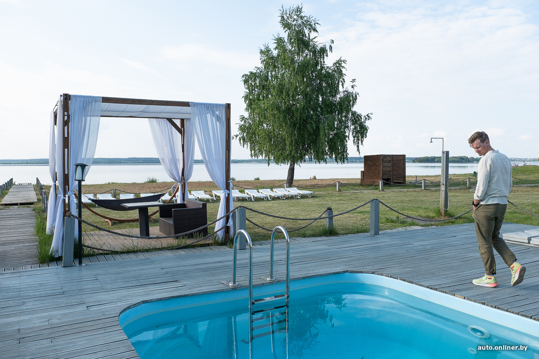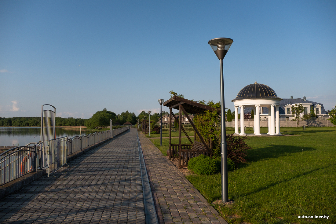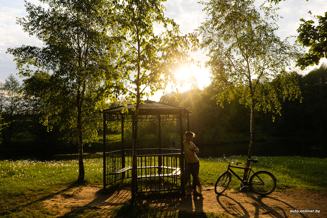 Но прежде чем зависнуть на шезлонгах в морском стиле, вернемся назад, к голубому зеркалу Дроздов. Мы поедем вдоль берега, задержимся только у милой беседки, красиво подсвеченной уже щедрым майским солнцем. Многим наверняка захочется устроить тут небольшую фотосессию — место отличное.