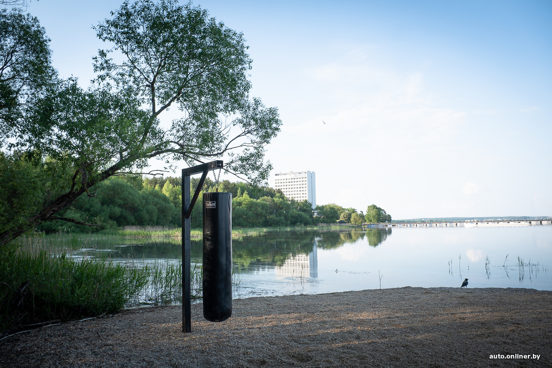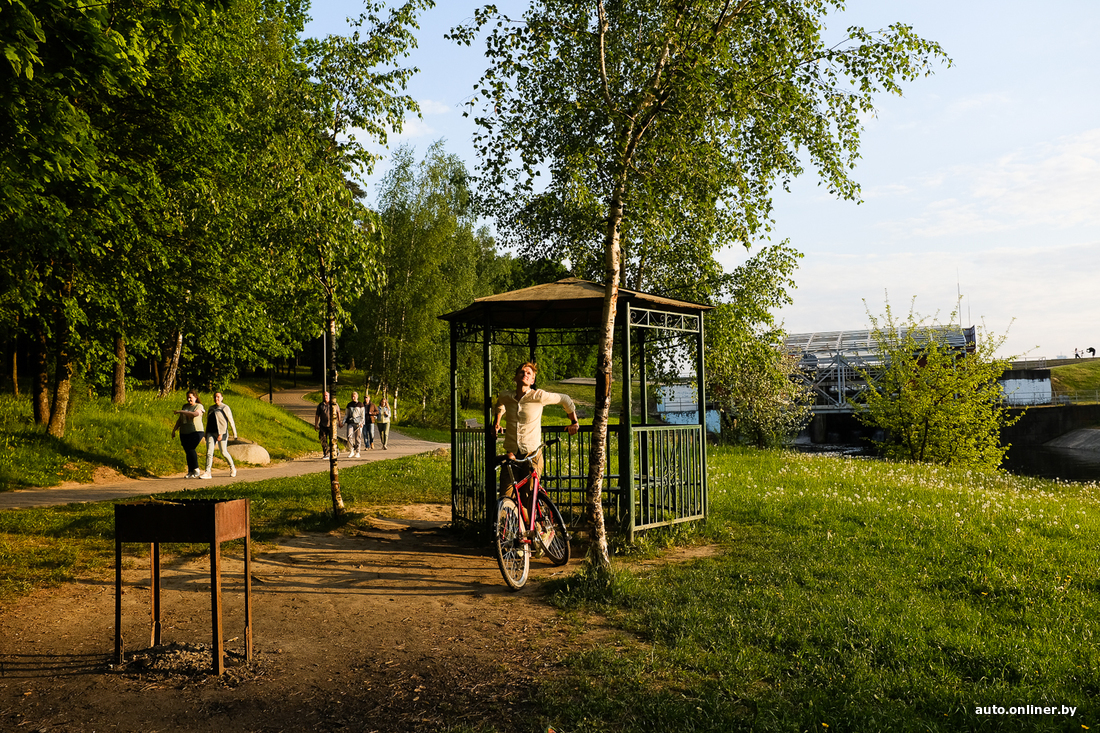 Песка, кстати, на пляж подвезли в достатке. За последнее время здесь появились игровые и воркаут-зоны, вдоль воды и через лес аккуратно проложены дорожки, на скамейках, на песке или прямо на траве под раскидистыми деревьями люди устраивают пикники. В выходной день летом тут яблоку негде упасть. Пешком далеко не уйдешь, проезда нет, а на велике — это лишь начало незабываемого пути.