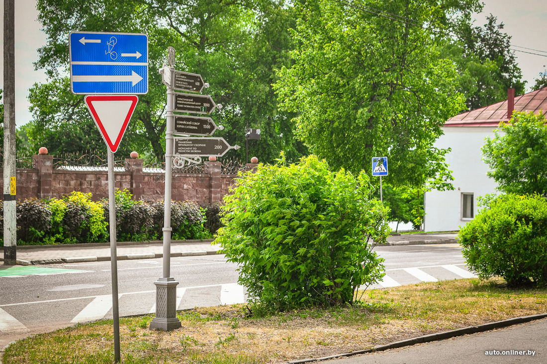 Историческая часть Полоцка расположена компактно, и проехать ее можно за небольшое время. Вот только проезжать совсем не хочется — от этого крутим педали совсем уж медленно, подолгу застревая то там, то сям. Ехать оказалось удобнее, чем мы предполагали вначале. На многих улицах движение велосипедов организовано по выделенной на проезжей части полосе, причем решение это принималось, как мы слышали, с учетом мнения велосипедного сообщества.