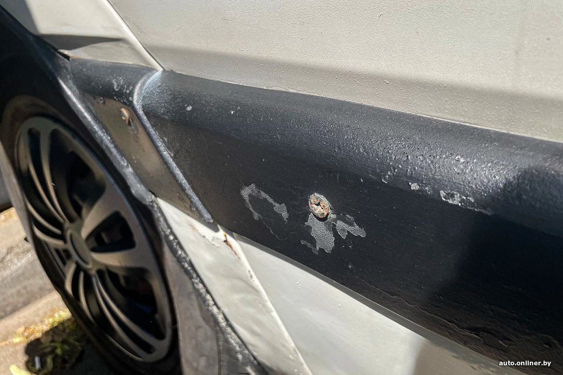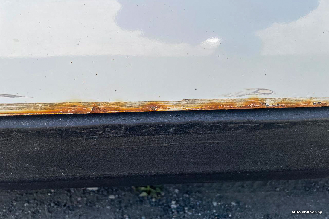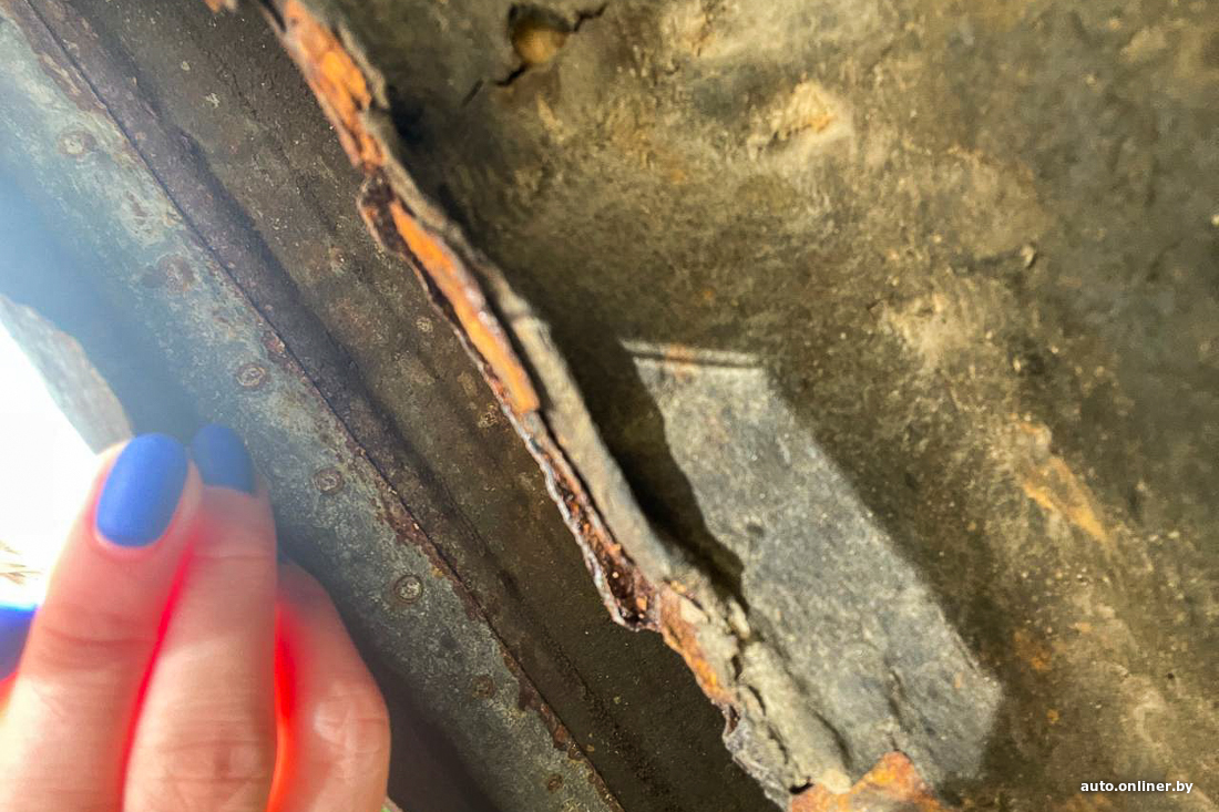 Пороги оценить не удалось — они закрыты пластиковыми кожухами. Владелец указал под один из пассажирских ковриков и объяснил — сквозных дыр нет, но там металл уже прогнулся, требуется сварка.