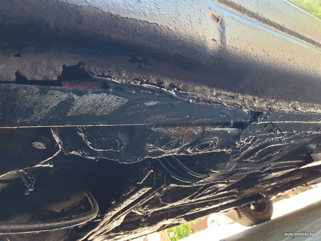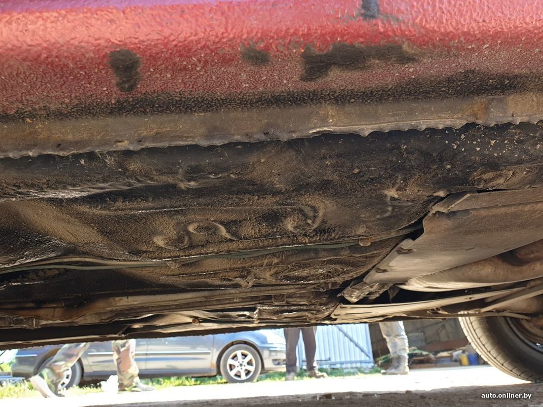 — Днище прямо по ржавчине, куда смогли добраться, обработано каким-то бюджетным антикоррозийным средством — чем-то вроде современного гудрона. Вон капли висят, — показывает Паша. — Брызговики новые в круг стоят — иногда так делают, когда уже бампер не к чему прикручивать.